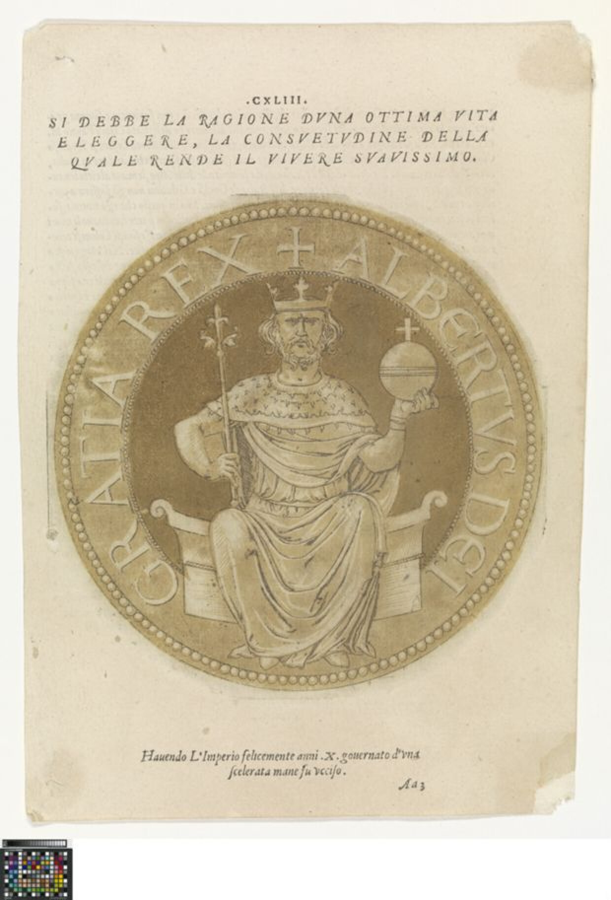 16de eeuwDit blad is afkomstig uit 'Le vive imagini di tutti quasi el'Imperadori', van de Brugse numismaat en drukker Hubert Goltzius. Deze publicatie bestaat uit een verzameling van portretmedaillons van koningen en keizers, die gebaseerd zijn op munten uit de tijd van de geportretteerde. Het gaat om een blad uit een Italiaanse druk die wellicht is uitgegeven in 1557 (tweede of derde editie van de uitgave). Koning Albert I is zittend op een troon weergegeven, met een scepter en wereldbol in zijn handen. Het medaillon is gedeeltelijk geëtst en gedeeltelijk gemaakt als clair-obscur houtsnede, gedrukt van een lichte en donkerbruine toonblok. Deze toonblokken zouden gesneden zijn door Joos Gietleughen. Onderaan en bovenaan het portret staat tekst in typografie.
