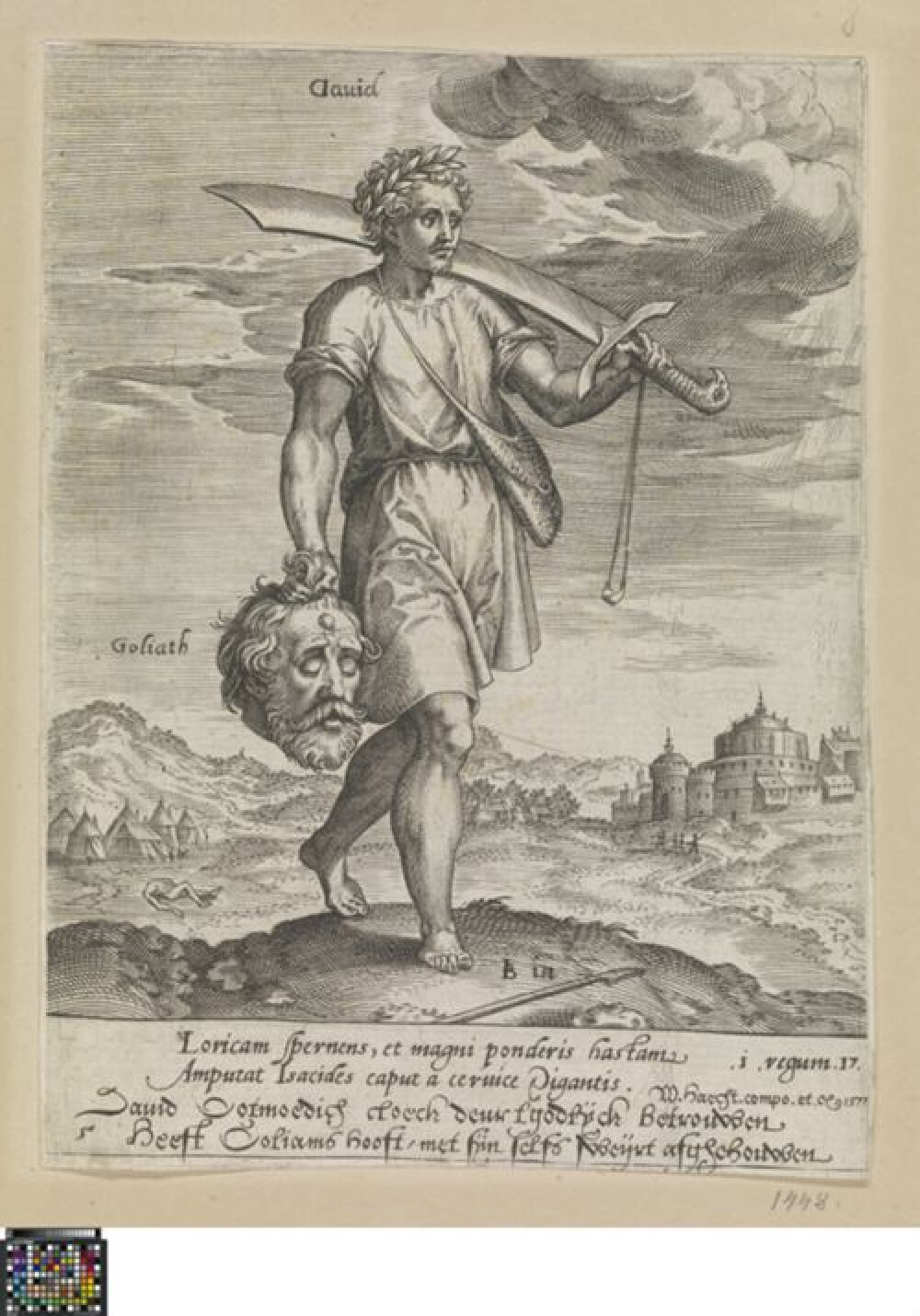 16de eeuwJudith is ten voeten uit afgebeeld (Holl. 154). In haar rechterhand houdt zij een stok waarop het hoofd van Holofernes gepiest is. In haar linkerhand houdt zij een zwaard. De prent behoort tot een reeks van 10 helden en heldinnen uit de oudheid en het oude testament die tirannen onthoofd hebben. De inleiding van de reeks geeft aan dat het een politieke allegorie betreft op de Spaanse overheersing. Het concept van de reeks is bedacht door Willem van Haecht. Van Haecht heeft de reeks ook uitgegeven. De prenten zijn per tweetal ontworpen door Maarten de Vos, Gillis Coignet, Marten van Cleve, Crispijn van den Broeck en een anonieme kunstenaar. De prenten zijn vermoedelijk allemaal gemaakt door Hieronymus Wierix. De prent met David is ontworpen door een anonieme kunstenaar met monogram IB of B en W en is binnen de reeks pendant van de prent met David, die ook door de anonieme kunstenaar ontworpen is.