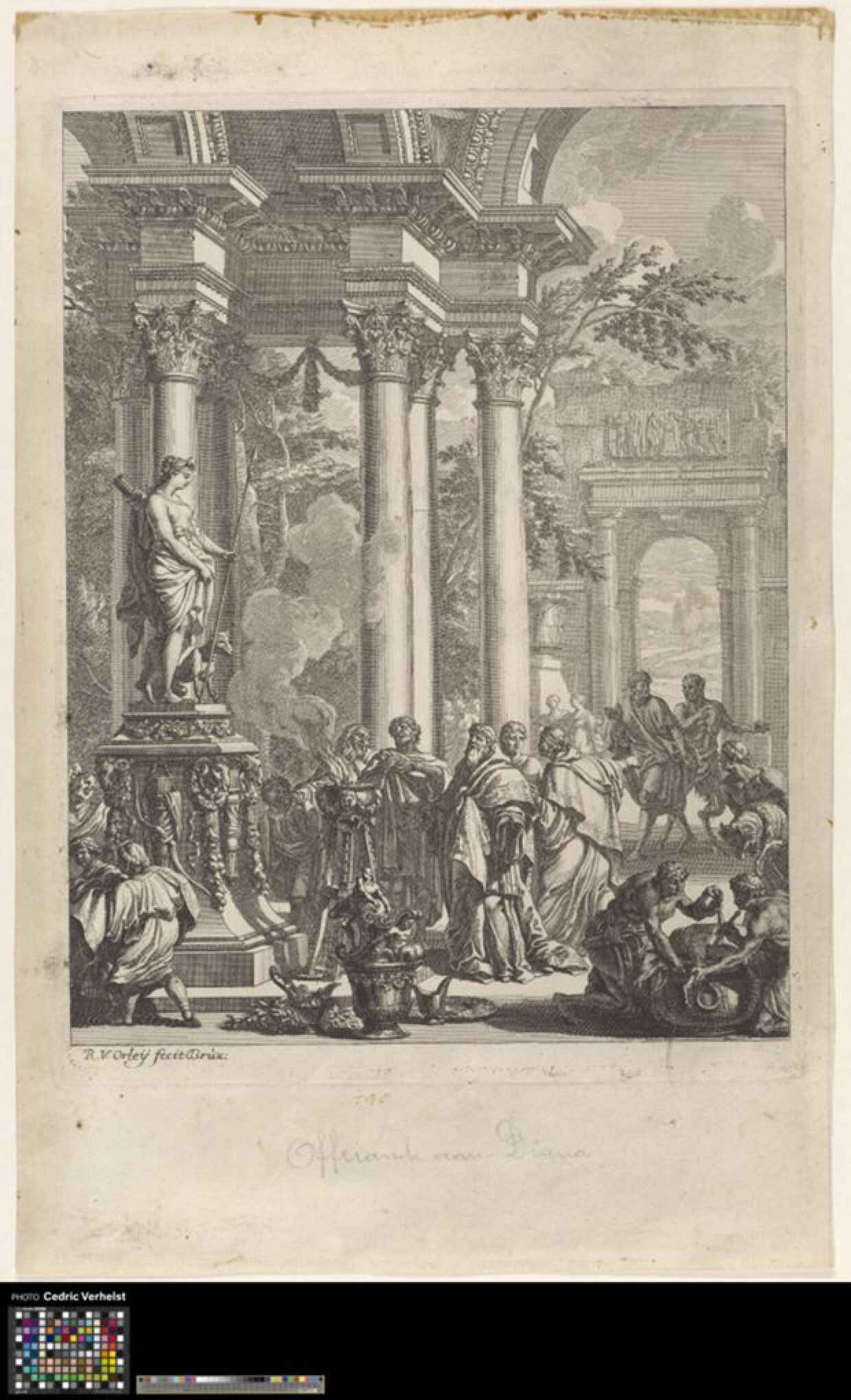 18de eeuw 17de eeuwPrent uit een reeks van twaalf prenten ter illustratie bij het toneelstuk Il Castro Fido, van Giovanni Battista Guarini. Deze prent toont het moment dat de vaders van de personages Silvio en Amaryllis een brandoffer aan de godin Diana brengen. De scene is gesitueerd in een tempel met gedecoreerde zuilen, in een bos. Links in de voorstelling is een sculptuur van de godin Diana op een hoge sokkel afgebeeld. Voor het beeld staan een aantal mannen rond pot met vuur, het offer dat zij de godin brengen. Rechts op de voorgrond wordt een schaap geofferd boven een grote pot. Rechts in de achtergrond komt een sater de tempel binnen om te vertellen dat de personages Amaryllis en Mirtillo gevonden zijn in een grot.