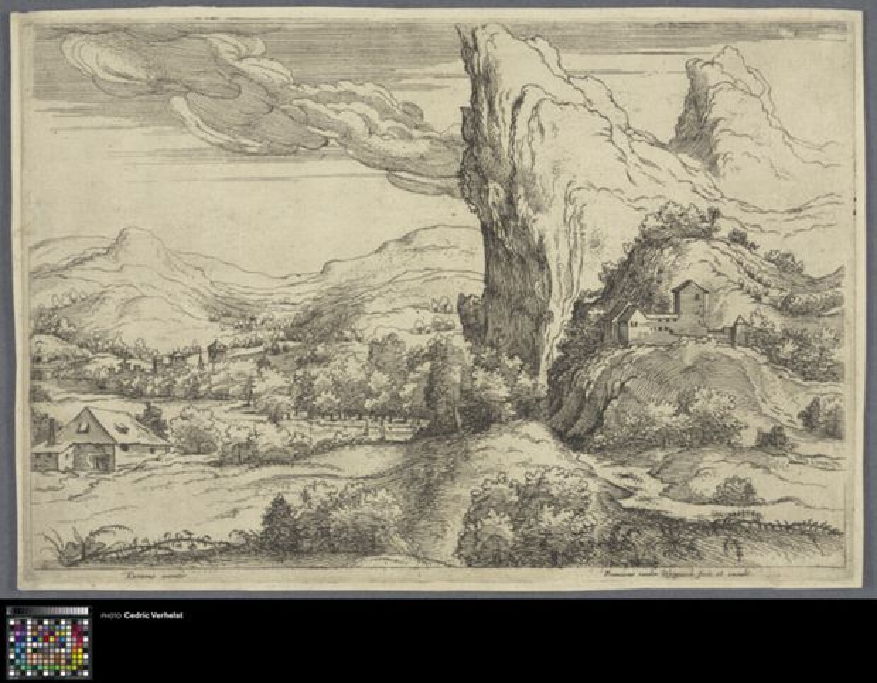 17de eeuwDe prent toont een zicht op een landschap, met aan de rechterzijde hoge kliffen. Voor de kliffen is gebouw op een heuvel afgebeeld, met bomen eromheen. Aan de linkerkant is een kleiner huisje met een puntdak en een schoorsteen te zien. Op de achtergrond zijn nog een aantal gebouwen afgebeeld, en tussen de bomen zijn zelfs twee kleine menselijke figuren te zien. In de lucht zweeft een grote wolk. Frans van den Wijngaerde maakte deze prent naar een ontwerp van Titiaan.