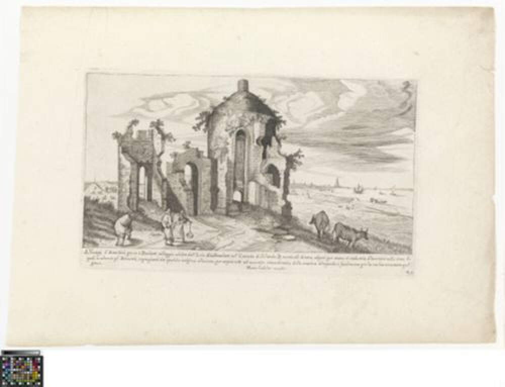 17de eeuwItalianiserend kustlandschap met de overblijfselen van de tempel van Venus bij Baia, gezien vanuit het oosten. In de voorgrond zijn enkele boten en figuren weergegeven. Deze prent maakt als nummer 44 deel uit van de reeks 'Vestigi della antichita di Roma, Tivoli, Pozzuolo et altri Luochi'.