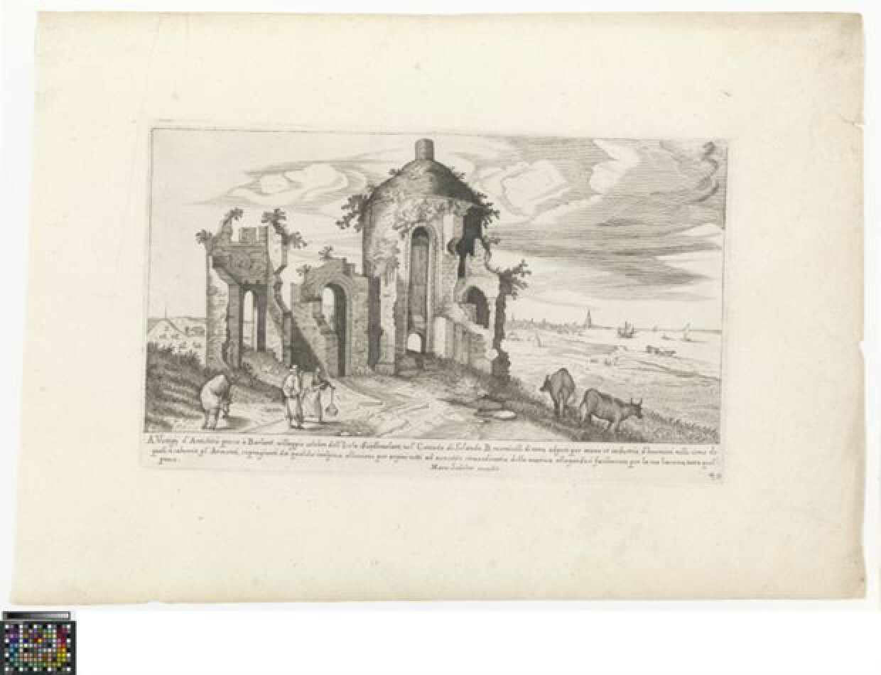 17de eeuwHollands kustlandschap met een ruïne bij Baarland. In de voorgrond zijn koeien, een man en een melkmeisje weergegeven. Deze prent maakt als nummer 49 deel uit van de reeks 'Vestigi della antichita di Roma, Tivoli, Pozzuolo et altri Luochi'. In het British Museum in Londen wordt de voorbereidende tekening van Jan I Brueghel bewaard (inv. SL,5236.52).