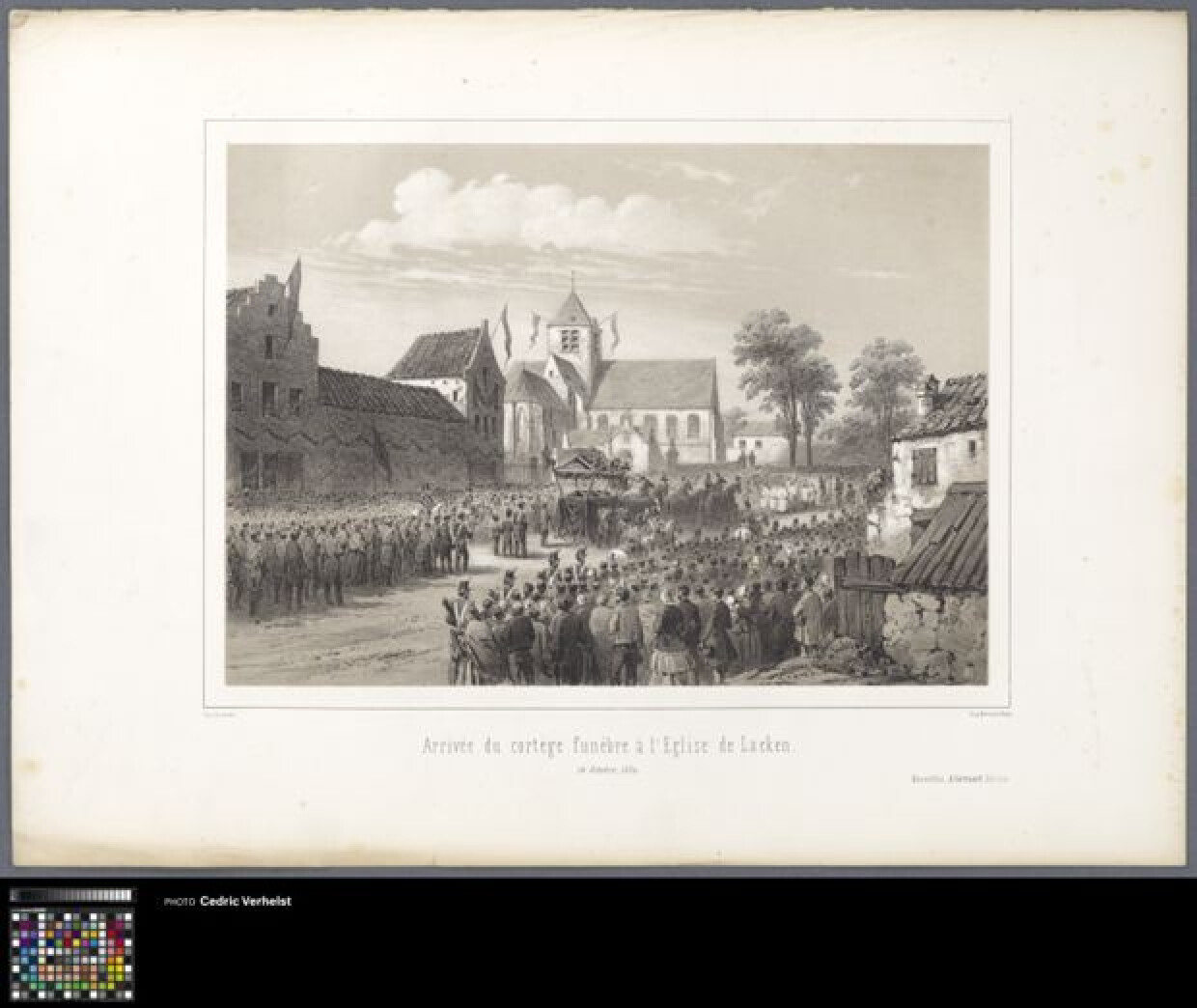 19de eeuwLithografie van de aankomst van de rouwstoet van Koningin Louise Marie van Orléans aan de kerk van Laeken. Hier zal ze in de tombe begraven worden. De opkomst is erg groot. De kar met de doodskist wordt getrokken door 6 paarden. De voorstelling speelt zich af op 14 oktober 1850.