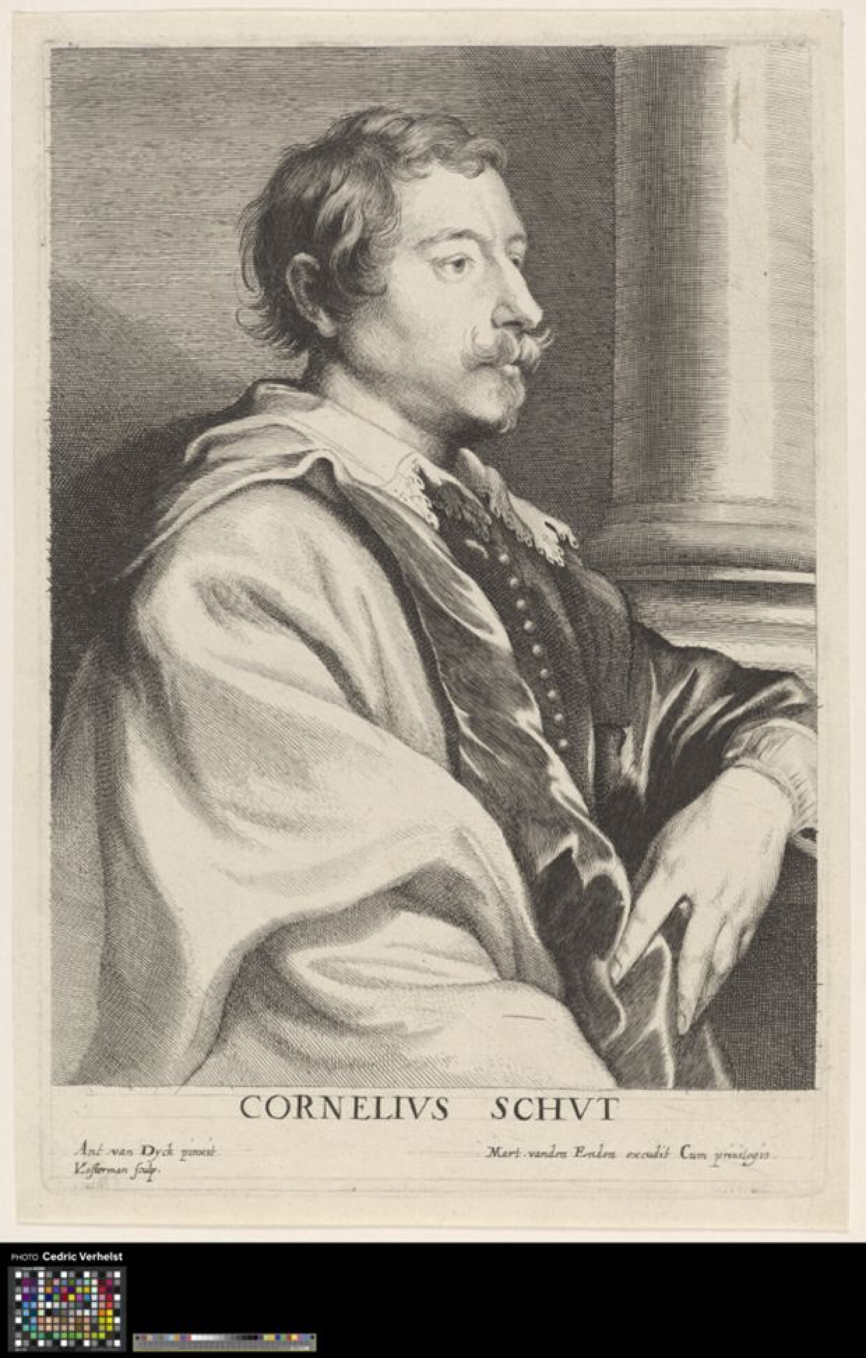 17de eeuwPortet in drie kwart, naar rechts. Het gezicht is bijna in profiel weergegeven, maar er is nog een deel van het linkeroog zichtbaar. Schut heeft kort golvend haar, een snor die aan de punten omhoog krult en een kleine sik. Hij draagt een zwart jasje met witte kraag en machet, en heeft over zijn rechterschouder een mantel in lichte kleur geslagen. Zijn linkerarm rust op een verhoging rechts in de voorstelling, met de hand naar beneden gericht en de middel- en wijsvinger gespreid. Op de achtergrond is aan de rechterkant de voet van een pilaar te zien.