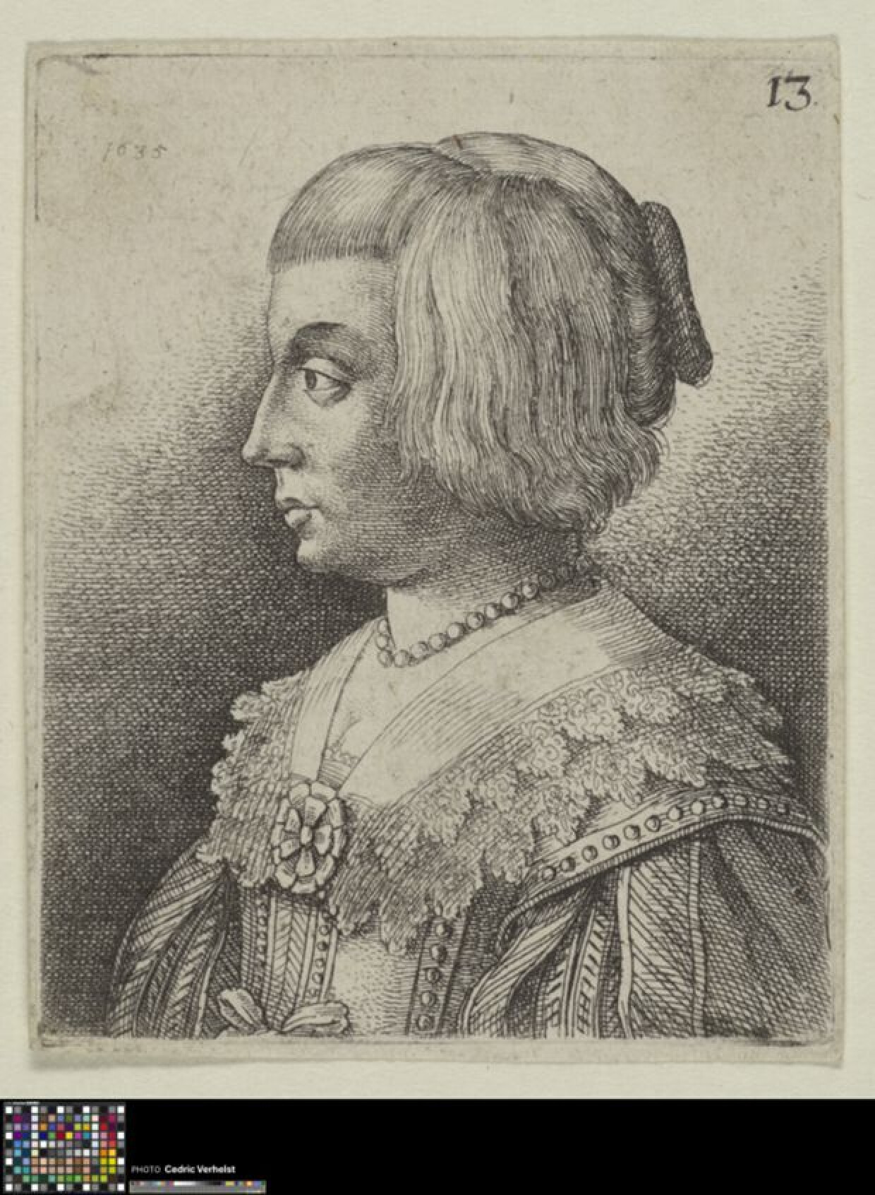 17de eeuwDe vrouw is in profiel afgebeeld en kijkt naar links. Ze draagt een kanten kraag met een broche in de vorm van een bloem op haar gewaad.