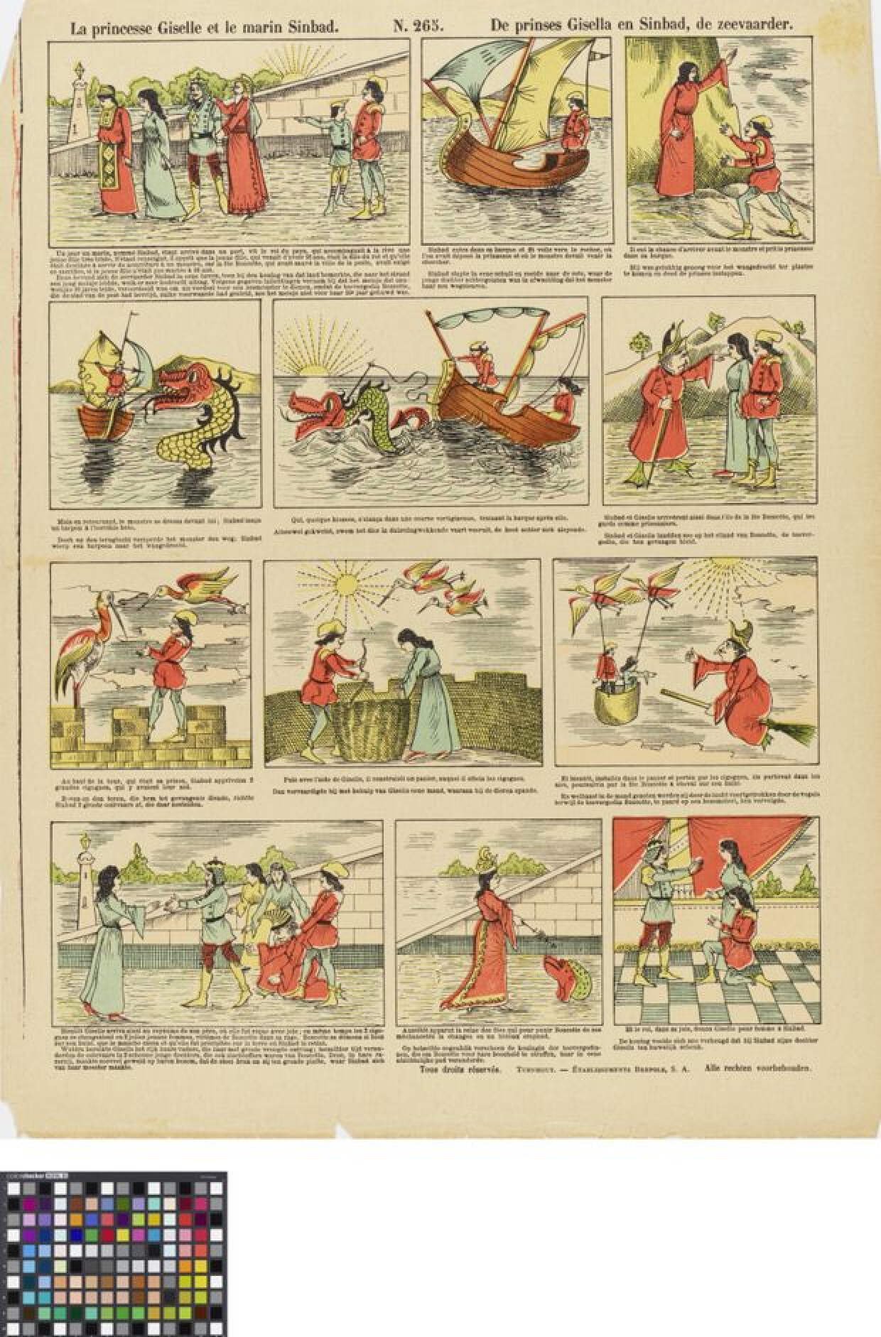 20ste eeuwDeze centsprent, nummer 265 in de reeks, werd gedrukt en uitgegeven door Etablissementen N.V. Brepols in Turnhout. In twaalf afbeeldingen wordt het verhaal van "De prinses Gisella en Sinbad, de zeevaarder" afgebeeld. De prenten hebben Franse en Nederlandse onderschriften. Het is een chromolithografie in blauw, geel, vleeskleur en rood. De personages dragen oosterse kledij. De zeevaarder SInbad ziet op het strand een koning een zestienjarig meisje naar het water leiden en hoort dat ze geofferd zal worden aan een zeemonster in ruil voor het einde van de pest, waarvoor de boze tovenares Boscotte gezorgd had. Sinbad gaat het meisje van de rots halen, verwondt het zeemonster dat hen met zich meesleept tot het eiland van Boscotte, waar ze op een toren gevangen gehouden worden. Sinbad richt twee ooievaars af en in een mand vliegen Sinbad en Gisella terug naar haar vaders land. Boscotte achtervolgt hen, maar stort neer en wordt gevat door Sinbad. De ooievaars veranderen in twee schone dochters en de koningin der tovergodinnen verandert Boscotte als straf in een afzichtelijke pas en Sinbad trouwt met Gisella.