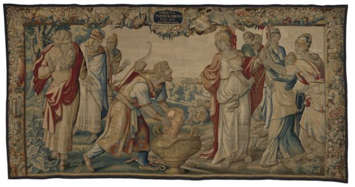 17de eeuwDit wandtapijt stelt een tafereel voor uit de Griekse geschiedenis. Thomyris, koningin der Skythen, wraakt de dood van haar zoon. Deze was door Cyrus, de Koning der Perzen gevangen genomen en gedood. Cyrus werd op zijn beurt door Thomyris gevat en onthoofd. Het hoofd van Cyrys werd vervolgens in een vaas vol bloed ondergedompeld, waarbij de Skytische Koningin letterlijk zijn bloeddorst wou stillen. Op de vaas op het tafereel staat dan ook nog eens het bijbelse tafereel van Judith en Holifernes afgebeeld. Rechts op de omgeplooide stootboord staat het keurmerk van Brussel (BB). Een gelijkaardig stuk met voorstelling van de Strijd tussen Romelus en Remus draagt naast het keurmerk ook het merk van de tapijtwever Erasmus de Pannemaker Jr. Bovendien weet men van bronnen dat de Pannemaker en zijn broer Frans in 1669 een contract tekenden voor een reeks van 6 wandtapijten met de Geschiedenis van Cyrus. Dit wandtapijt maakt zonder twijfel deel uit van deze reeks. Volgens sommige bronnen zou deze Cyrus-reeks op oudere 16de eeuwse modellen teruggaan.
