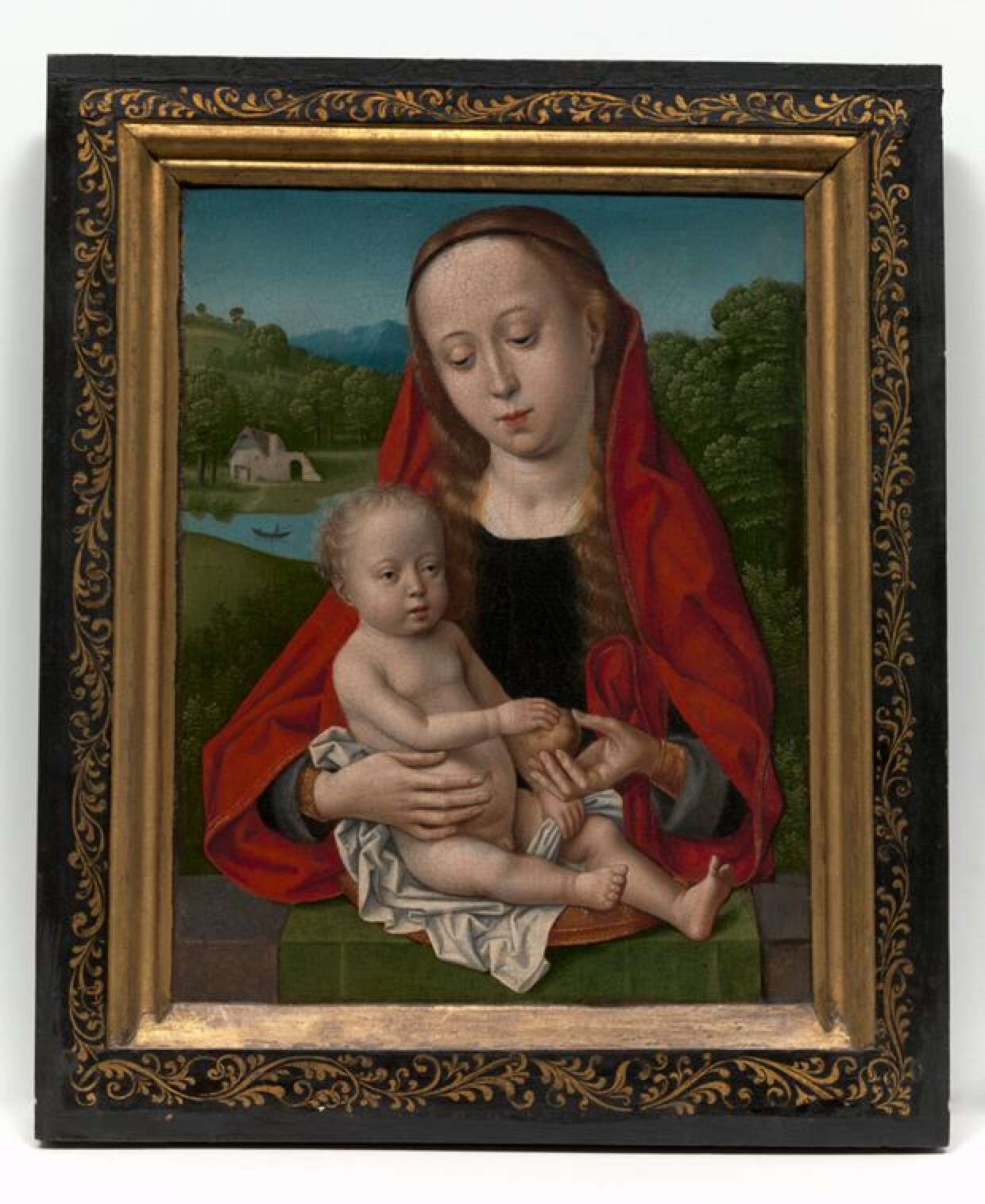 16de eeuw 15de eeuwDe Madonna staat achter een muurtje dat tot aan haar middel reikt en waarop het Kind op een kussen zit. Op de achtergrond strekt zich een landschap uit. Het Madonna-en-Kindtype is gekopieerd naar een schilderij van Hans Memling in het Museu Nacional de Arte Antiga van Lissabon. De kopiist wijzigde het landschap en liet de vensternis, die de Madonna oorspronkelijk omspande, wegvallen. Het formaat is ook iets kleiner.