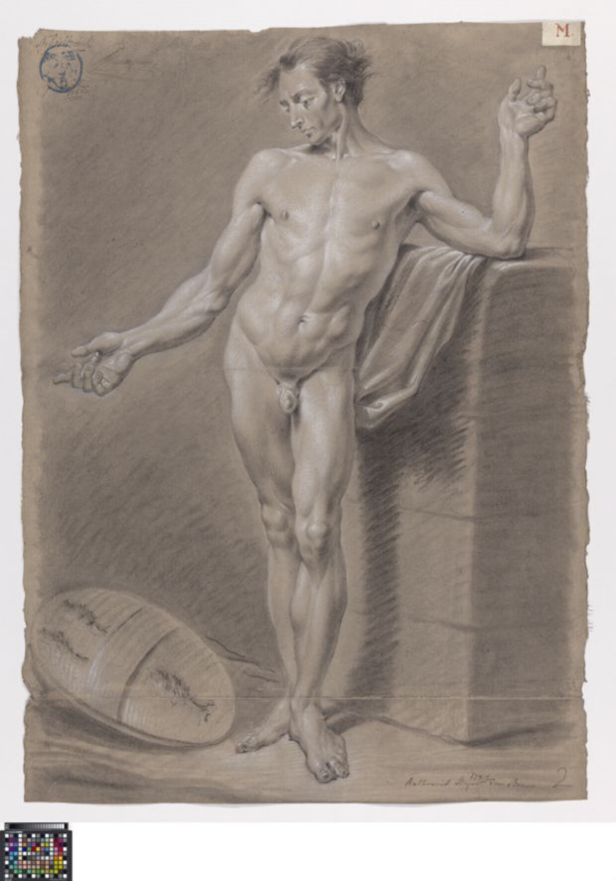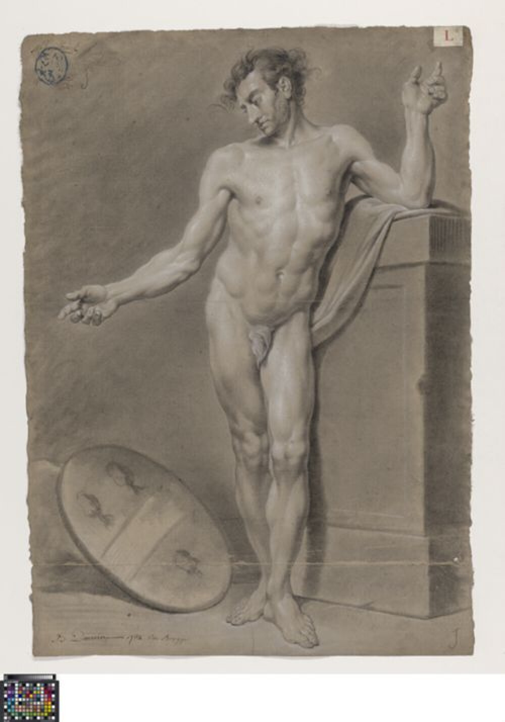 18de eeuwAcademische studie naar levend model van een staand mannelijk naakt, getekend door Antoine Steyaert in 1782. Steyaert, afkomstig uit Brugge, won hiermee de tweede prijs in het prijskamp van 1782 aan de academie van Brugge in de klas naar het levend model. Bernard Duvivier won de eerste prijs (0014.GRO0088.II). Het model is frontaal en voluit afgebeeld. De naakte man staat in contrapost. Hij leunt met zijn linkerelleboog op een hoge sokkel waarop een doek gedrapeerd is. Hij kijkt in profiel naar links met gezonken hoofd en wijst met zijn rechterhand omlaag naar het wapenschild naast zijn voeten. Dit is vermoedelijk het wapen van Simon of Pépin. Het gebruikte medium is zwart krijt of houtskool, met hoogsels in wit krijt. Er is een aangelijmde strook onderin met verderzetting van de tekening. Hierop werd de naam van de leerling-tekenaar genoteerd na afloop van de wedstrijd. Linksboven is de academiestempel op de tekening gedrukt. Hier plaatsten Norbert Heylbrouck (leraar), Frans Vande Steene (secretaris) en Paul de Cock (directeur) hun handtekening. De tekenletter 'M' die Steyaert toegewezen kreeg voor deelname werd rechtsboven op de tekening verlijmd. Zijn behaalde prijs (2) schreef men onderaan rechts op de studie. Antoine Steyaert tekende in dezelfde wedstrijd een tweede studie naar levend model (0016.GRO0070.II).