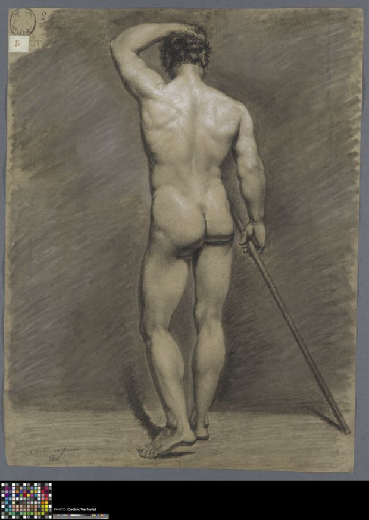 19de eeuwAcademische studie van een mannelijk naakt, gemaakt door Charles De Graeve in 1816. De Graeve was toen leerling in de klas naar model aan de Academie Brugge. Voor de wedstrijd om prijs maakte hij twee studies (zie ook 0016.GRO0163.II), waarmee hij de tweede prijs behaalde. Frans Fleminck werd primus (0022.GRO0532.II). Het model staat in contrapost, met zijn rug naar de toeschouwer. Zijn linkervoet staat ietwat naar achter. Hij houdt zijn linkerarm omhoog, de hand rustend op zijn kruin. Zijn rechterarm hangt ontspannen en in zijn hand houdt hij een lange stok vast. De tekening is gemaakt in zwart krijt of houtskool, gehoogd met wit krijt. De verschillende aantekeningen wijzen op De Graeves wedstrijddeelname. Linksboven is de academiestempel met handtekening van directeur Ducq te zien. Op het etiket staat de tekenletter 'B', aan De Graeve toegewezen voor deze prijswedstrijd. Dat hij de tweede prijs behaalde, werd met een '2' genoteerd. Nadien werden zijn naam, afkomst en het wedstrijdjaar onderaan opgeschreven.
