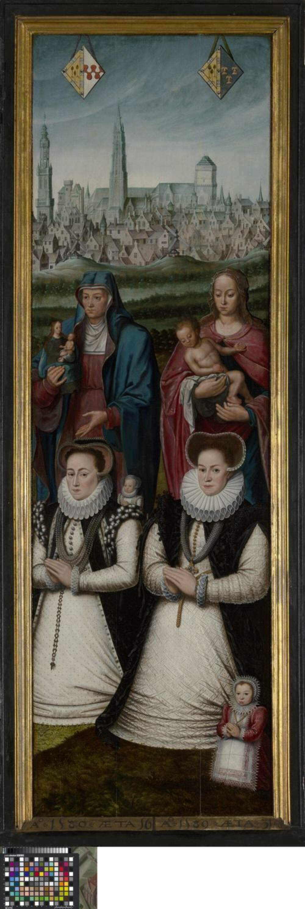 16de eeuwDe uit Spanje afkomstige familie Pardo was in het zestiende-eeuwse Brugge een vooraanstaande familie. Juan Pardo de jonge liet zich portretteren door een lid van de Brugse schildersdynastie Claeissens, samen met zijn echtgenotes Anna Ingenieulandt en Maria Anchemant. Traditioneel staan de zonen bij de vader afgebeeld en de dochters bij de moeder. De achtergrond is een panoramisch gezicht op Brugge, waarbij de torens van de belangrijkste kerkelijke en burgerlijke gebouwen zijn weergegeven. Deze twee luiken werden in de negentiende eeuw in het Sint-Juliaanshospitaal samen getoond met de 'Aanbidding der Wijzen', eveneens in de collectie van het Groeningemuseum (1974.GRO0031.I). Oorspronkelijk hoorden de zijluiken bij een verdwenen middenpaneel in de Sint-Donaaskathedraal van Brugge.