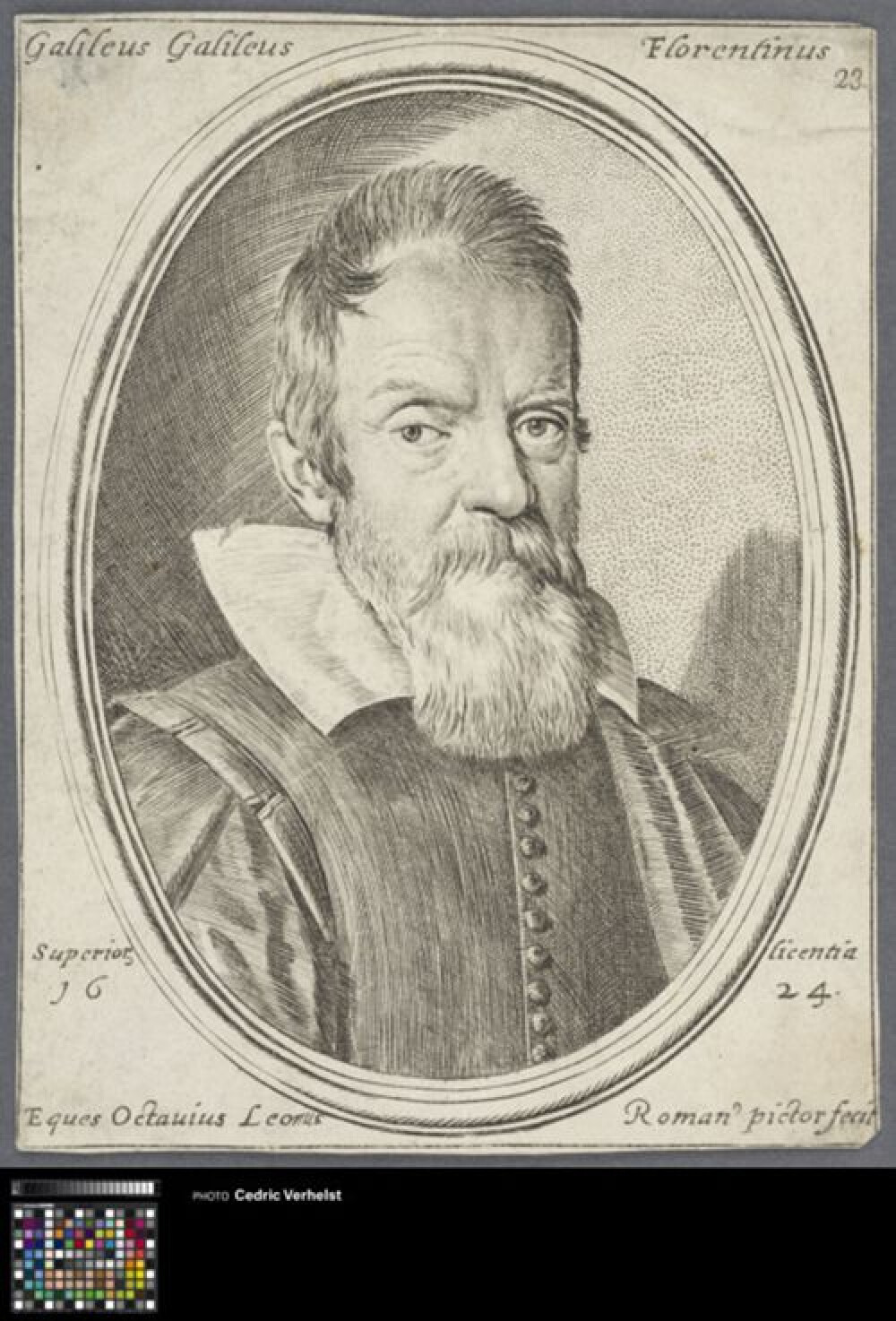 17de eeuwGalileo Galilei (1564 -1642) was een Italiaans natuurkundige, astronoom, wiskundige en filosoof. Hij bewees dat de aarde om de zon draait. Galileo is hier ten halve lijve naar rechts afgebeeld, binnen een ovalen omlijsting in een rechthoekig kader. Hij draagt een jasje met een rij knopen aan de voorkant en een witte kraag. Rondom het ovale kader staan inscripties gedrukt.