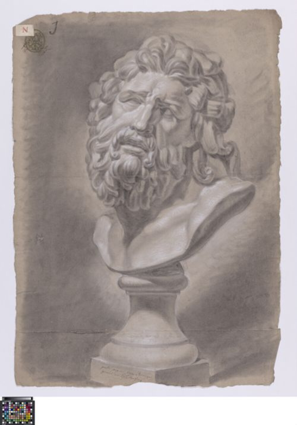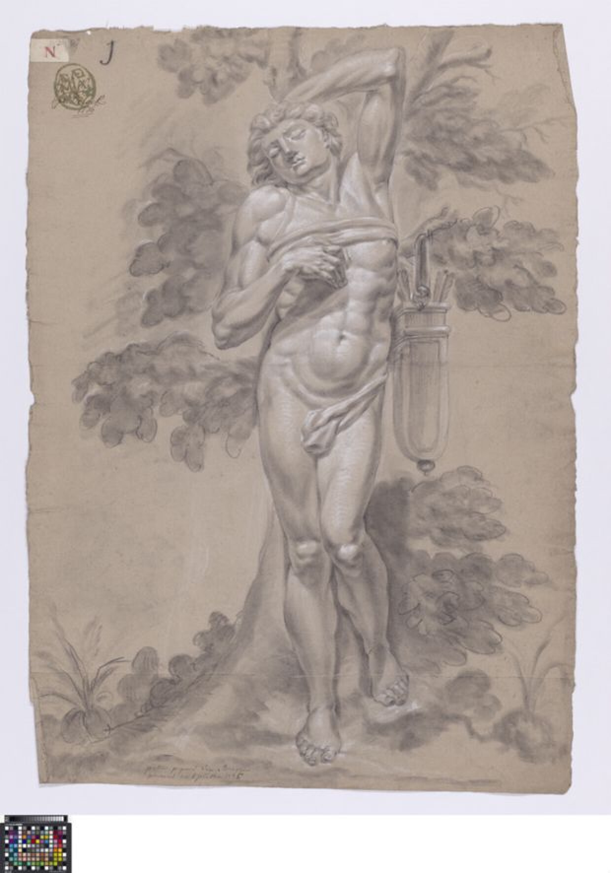18de eeuwAcademische studie van de stervende slaaf, getekend door Pieter Pepers II in 1776 naar sculptuur van Michelangelo. Pepers was ingeschreven als leerling aan de Academie van Brugge. Hij maakte deze studie tijdens de prijswedstrijd in de klas naar sculptuur en won de eerste prijs. Hij tekende ook een tweede studie naar sculptuur: 0016.GRO0048.II. De stervende slaaf is getekend naar een afgietsel van het beeldhouwwerk van Michelangelo. Pepers voegde een lendendoek toe aan de naakte figuur en werkte de achtergrond uit. De stronk achter het lichaam van de slaaf vervolledigde hij tot een boom met gebladerte. Hij voegde rechts van de figuur ook een pijlenkoker toe die aan een tak hangt. Het gebruikte medium is zwart krijt of houtskool, afgewerkt met hoogsels in wit krijt. Onderaan de studie is een papierstrook aangelijmd waarop de voorstelling wordt verdergezet. Daarop staat ook de aantekening: Pieter Pepers van Brugge, primus na 't plaster, 1776. De studie draagt linksboven het etiket met de tekenletter 'N' , toegewezen aan Pepers voor zijn deelname aan het concours en de anonieme jurering. Directeur Paul de Cock ondertekende de wedstrijdtekening op de plaats waar de academiestempel op het tekenpapier werd gedrukt. De behaalde prijs is hier eveneens aangeduid met een 'J' of '1'.
