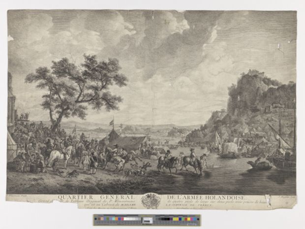 18de eeuwOp deze combinatie van ets en gravure zien we een drukte van je welste in en om een Hollands legerkamp. Links op de voorgrond naast een legertent zien we soldaten dobbelen op een trommel. Er linksboven zien we een venter die eten en drinken verkoopt en daarboven een soldaat die een vrouw het hof aan het maken is. Lastdieren en een huifkar dragen voorraden mee en onder de boom liggen gewonde soldaten te rusten. Centraal links zien we soldaten te voet en te paard met ervoor een stel vechtende honden en daar rechts van een geitje en twee kinderen die dreigen vertrappeld te worden door een paard. Trompetters blazen het vertrek. Van rechtsonder tot in het midden links van de prent loopt een rivier. Van de rechterzijde varen voorraadsloepen met tonnen aan en op de heuvel erboven zien we ook de fouragetenten die het leger moeten bevoorraden. Aan de rechterkant in het midden zien we een ommuurde kerk en helemaal op de top van de rotsen een fort dat boven het landschap uittorent.