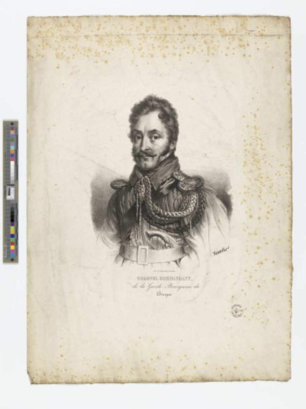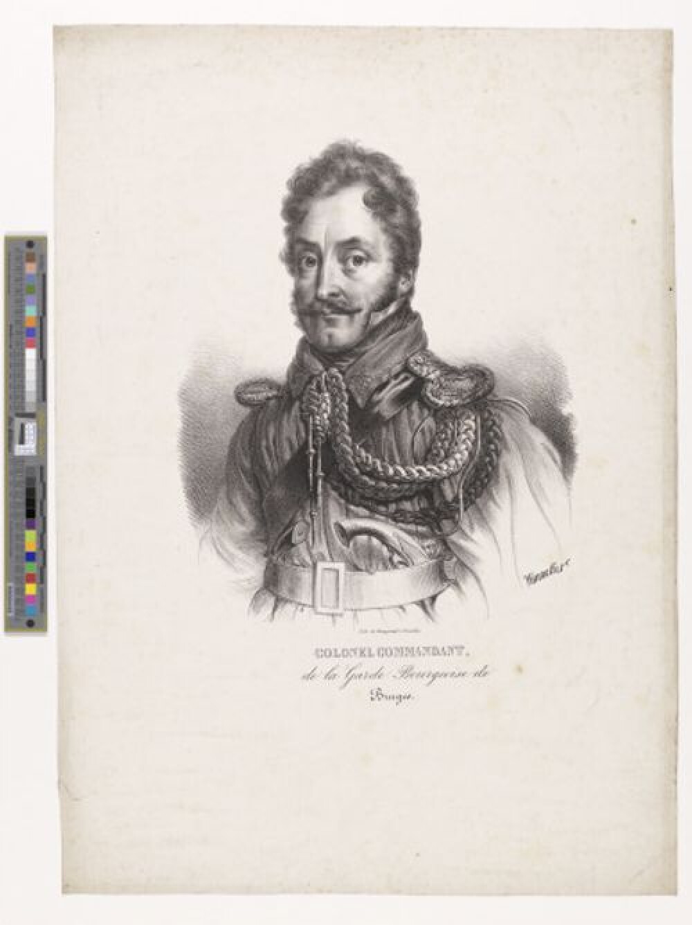 opschrift (onder de voorstelling): Lith. de Burggraaf à Bruxelles / Colonel Commandant / de la garde Brugeoise de / Bruges