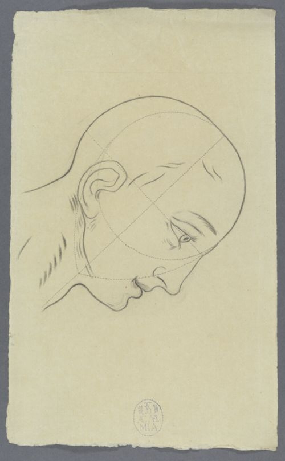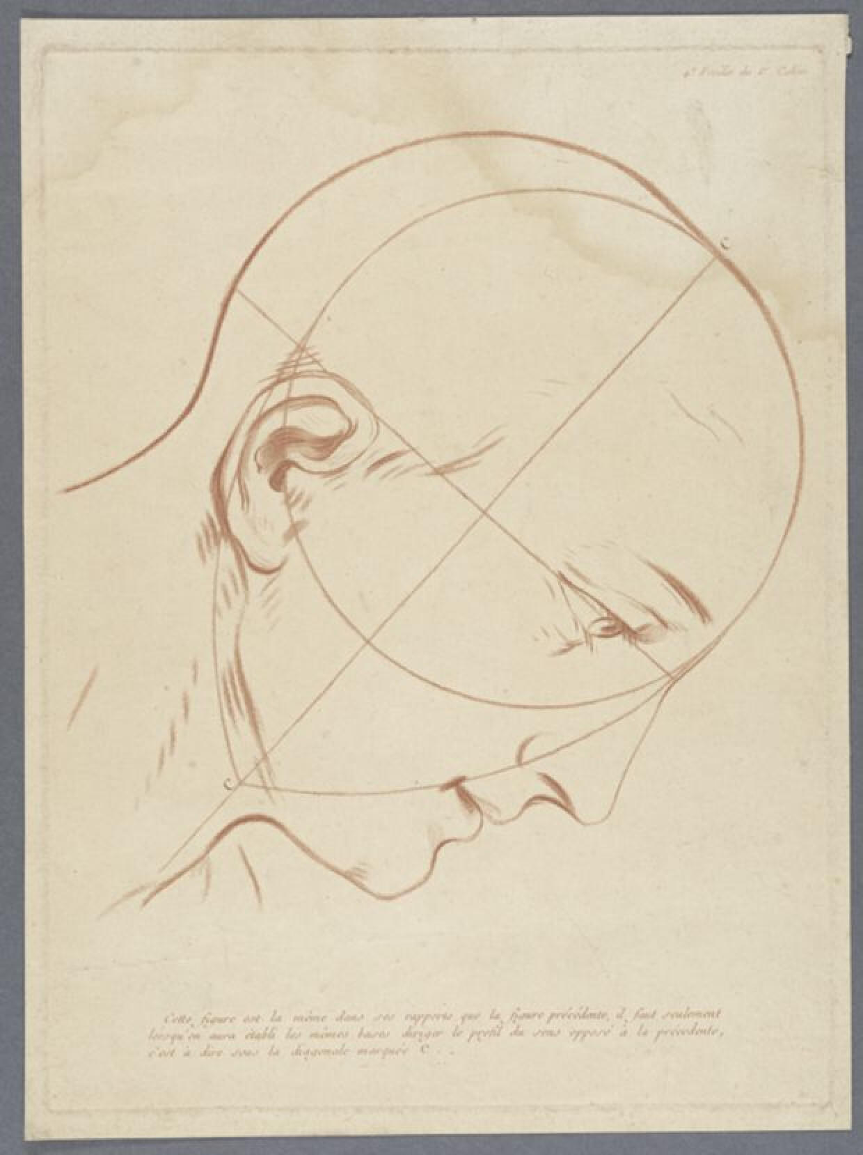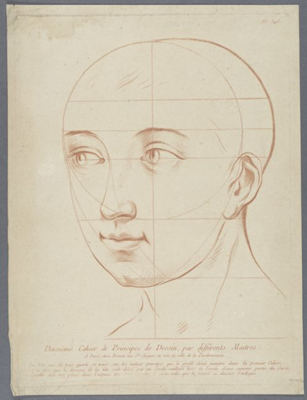 18de eeuwAcademische prent met een studie van een gezicht, gegraveerd door Bonnet. Het gaat om het vierde blad uit het "Deuxième Cahier de Principes de Dessin, par differents Maitres". Het gezicht is in profiel naar rechtsonder afgebeeld, met aanduiding van de proporties en vormen binnen het gezicht door rechte en gebogen lijnen. De functie van de prent kan wellicht gekaderd worden binnen de educatieve context van kunstacademies.