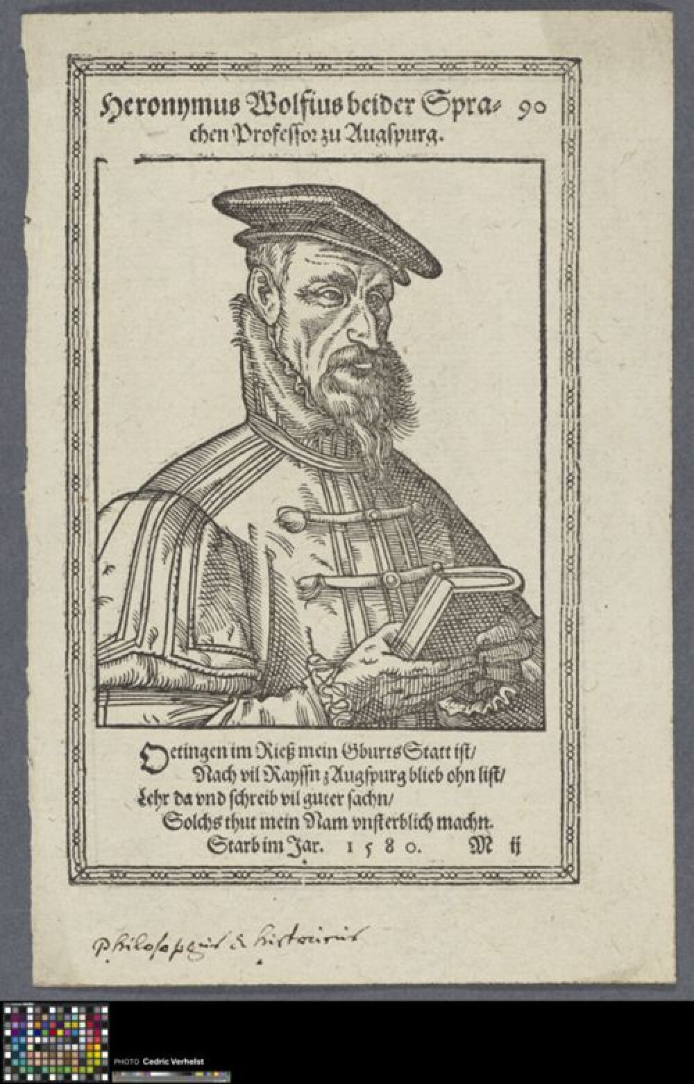 16de eeuwPortret van Johannes Hartung (februari 1505 - 16 juni 1579), Duitse humanist en filoloog. Als specialist in de Griekse en Hebreeuwse filologie bekleedde hij leerstoelen in Heidelberg en de Albertina universiteit in Freiburg im Breisgau. Dit busteportret toont de humanist in frontaal aanzicht met een boek in de handen. De houtsnede is de 89ste illustratie uit het "Contrafacturbuch" van Nikolaus Reusner, uitgegeven bij Bernhard Jobin in 1587. Dit boek bevat 103 portretten van hervormers, protestanten, gereformeerden en humanisten. Elk portret is omkaderd door een rechthoekige lijst met parelmotief en voorzien van een begeleidend opschrift in boekdruk onder de voorstelling. Volgens het voorwoord zouden de beeltenissen teruggaan naar tekeningen van Tobias Stimmer, Johan Holbein en Christoph Maurer. De prent maakt deel uit van een album met (losse) portretten uit de 16de en 17de eeuw (2014.GRO0019.III).