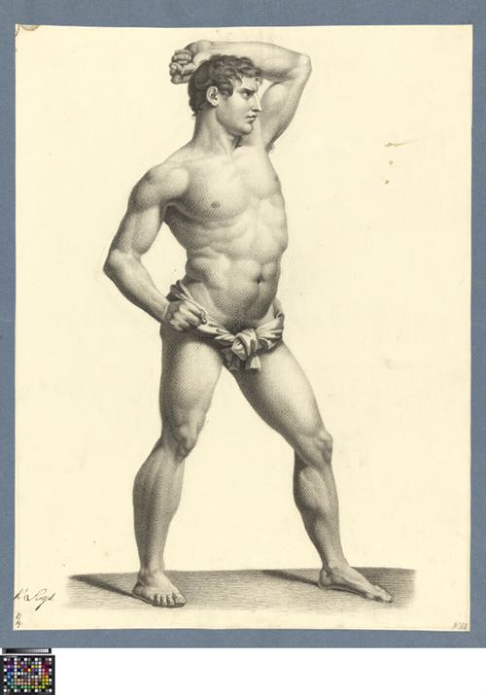 19de eeuwAcademische studie naar prent van een staand mannelijk naakt als worstelaar, getekend door Jean-Baptiste van Maldeghem in 1826. Van Maldeghem was toen leerling in de eerste klas naar prenten aan de Academie Brugge. Hij nam deel aan het prijskamp van 1826 en won de eerste prijs. Volgens het opschrift op de tekening was hij afkomstig uit Dentergem. Het onderwerp van deze wedstrijdstudie is een prent waarop een naakte worstelaar afgebeeld is. De man draagt een lendendoek en staat met gespreide benen in profiel naar rechts. Hij houdt zijn linkerarm op zijn hoofd, zijn rechterhand steunt op zijn heup. Het gaat om een studie naar de prent 'Lutteur', door Girard (graveur), naar tekening van Hervier. Een overeenkomstige prent wordt bewaard in het KASK Gent (CIV_143_50) en het Prentenkabinet KBR (S.II 101282). Het gebruikte medium is zwart krijt of houtskool. Het etiket met het tekennummer van de leerling is wellicht verdwenen doordat de bladranden bijgesneden werden. Linksboven is nog een restant van de academiestempel zichtbaar, met de handtekening van Joseph Ducq, directeur van de Academie. Linksonder werd de naam van de leerling-tekenaar na afloop van de wedstrijd genoteerd, met daaronder de behaalde prijs. De tekening is bewaard in een album met andere academietekeningen naar prenten. Een tweede tekening door van Maldeghem bevindt zich in dit album: 0016.GRO0142.31.II. Carolus Loys werd tweede in de wedstrijd van 1826 en tekende naar hetzelfde onderwerp: 0016.GRO0142.32.II.