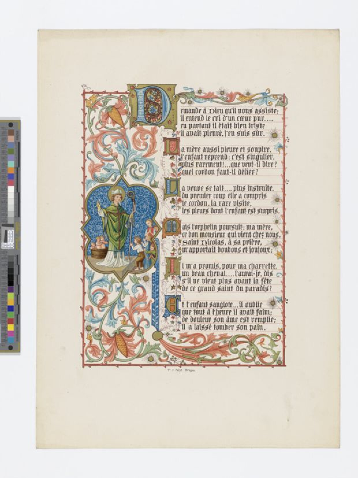 Een chroomlithografie in neogotische stijl met geschreven sonnetten over liefdadigheid door Auguste Lepas. De sonnetten zijn in grote Gotische letters gedrukt. De marge is versierd met bloemen en Sint-Niklaas met een achttal adorerende kinderen worden afgebeeld. Twee engelen dragen een leuze over barmhartigheid. De litho maakt als eerste plaat deel uit van een door Jules Heilbig gemaakte reeks lithografieën ter herinnering van de bazaar in Luik in 1875. Deze originele serie van 7 platen werd op 155 exemplaren gedrukt door de Brugse uitgeverij Jacques Petyt. Schilder en kunsthistoricus Jules Heilbig wordt samen met Jacques Petyt beschouwd als de absolute koplopers van de Belgische neogotiek. Ze werkten dan ook vaak samen.