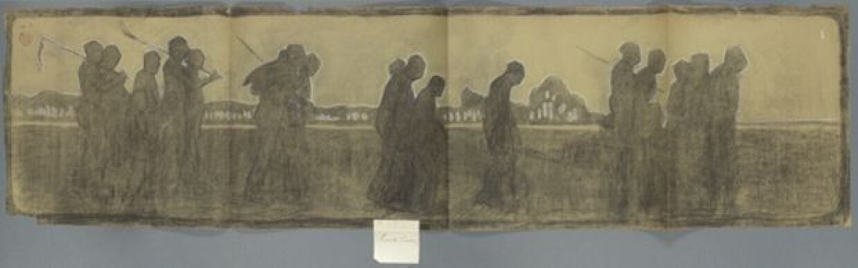 20ste eeuwAcademische compositiestudie van een stoet landbouwers, getekend door Constant Permeke in 1905. Met deze studie behaalde hij een met Ernest Callebout gedeelde eerste plaats binnen de lessen Historische samenstelling aan de Brugse academie. De landbouwers lopen in een rij achter elkaar, als een stoet of optocht. Er zijn in totaal ongeveer 19 figuren afgebeeld, vermoedelijk mannen, vrouwen en kinderen. Ze hebben gebogen houdingen die een teneergeslagen gevoel oproepen. Ze dragen gereedschap zoals een zeis en vlegel, of hebben een zak over de rug. De focus van deze compositiestudie ligt op de algehele opzet; de figuren zijn schematisch weergegeven, met weinig gedetailleerde uitwerking. Zowel de figuren als de grond waarop ze lopen, zijn ingevuld met houtskool, waardoor ze moeilijk te onderscheiden zijn. Ze contrasteren met de blanco gelaten luchtpartij, waartegen een donkere bomenrij in een polderlandschap afsteekt. Het gebruikte medium is zwart krijt of houtskool op papier. De contourlijnen zijn benadrukt met wit krijt.