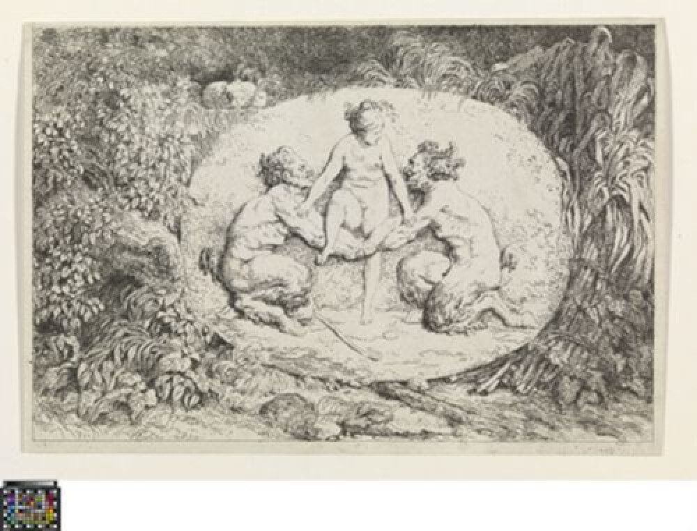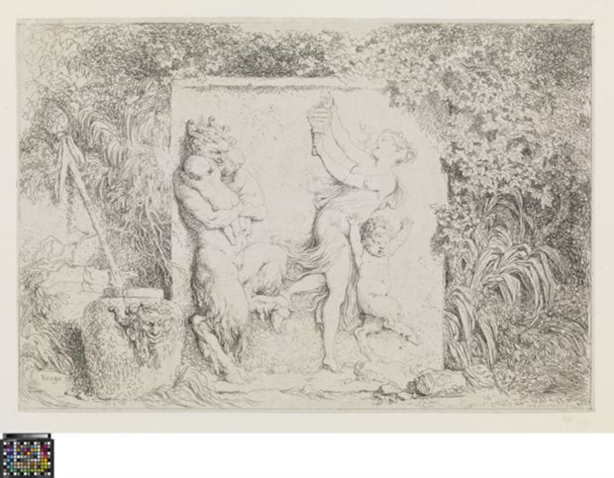 Voorstelling van een sater met twee baby's in de armen en een jonge sater die dansen op de klanken van het sistrum, bespeeld door een jonge vrouw. Deze prent behoort tot een reeks van vier etsen die antieke gesculpteerde bas-reliefs representeren met voorstellingen van saters.