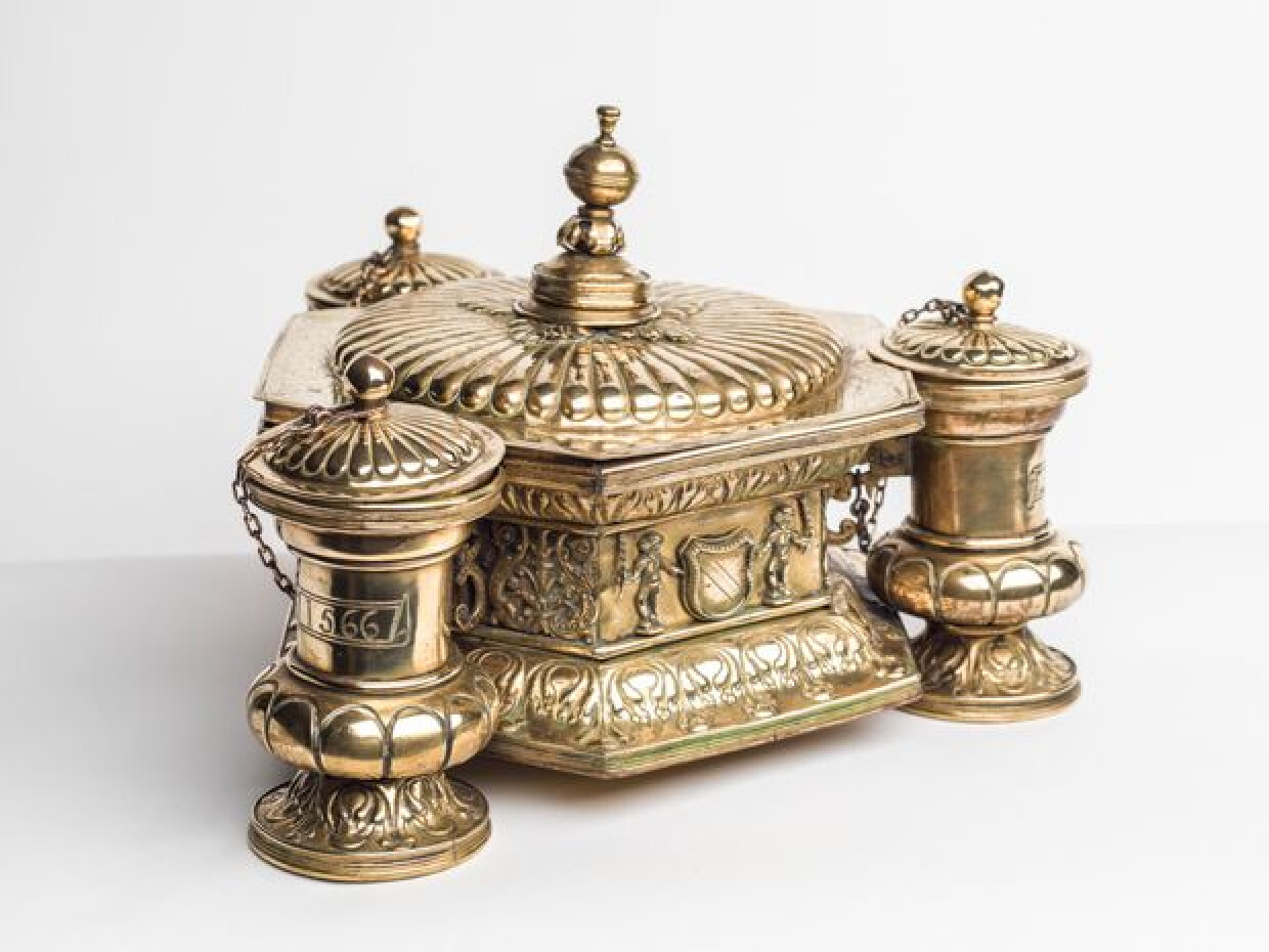 16de eeuwInktstel bestaande uit een centrale zeshoekige doos die binnenin verdeeld is in twee compartimenten, met ernaast drie kleine cilindervormige inktpottenhouders met deksel aan een ketting. Op de drie kleine ronde houders staat telkens het jaartal 1566 gegraveerd. Op de zijkanten van de centrale doos staat driemaal het wapenschild van het Brugse Vrije.