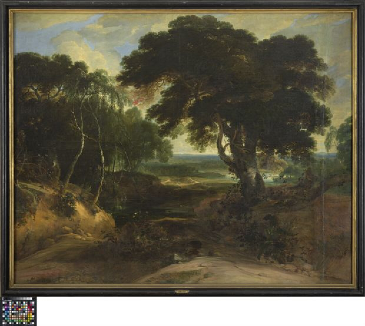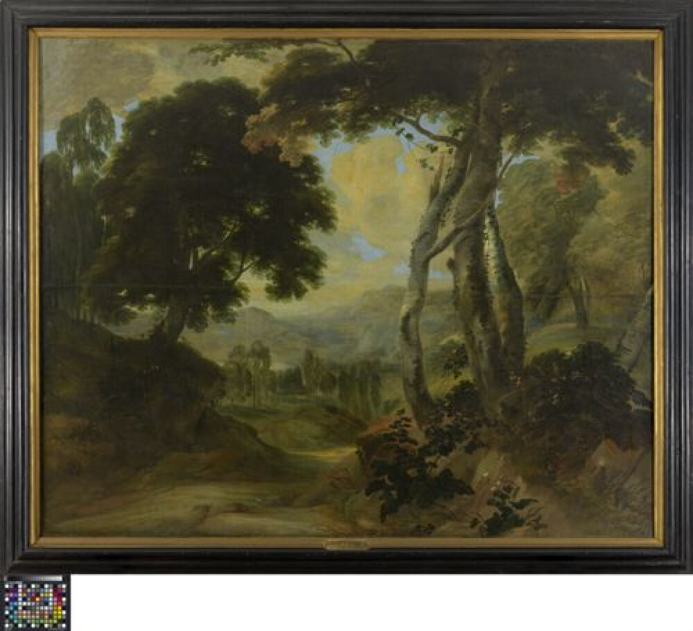17de eeuwTussen twee beboste bermen leidt een weg naar een open heidevlakte, die door de zon hel wordt beschenen. De horizont wordt gevormd door zachtglooiende en beboste heuvels, met enkele huizen en een kerk. Dit werk vormt een eenheid met 0000.GRO0002.I en 0000.GRO0003.I. De drie schilderijen hebben nagenoeg dezelfde afmetingen en wellicht dezelfde pedigree. Ook stilistisch is er een opmerkelijke band. Niet alleen kan men spreken van een gelijkaardige schilderswijze, er is ook een gelijkvormige compositiestructuur: het betreft telkens om een landschap, gezien vanuit een hoog blikpunt en met een naar de verte kronkelende weg of waterpartij tussen twee compacte coulissen van bomen. Het is aannemelijk dat de drie werken steeds hebben samengehoord. Van Achtschellinck is geen enkel gesigneerd of gedocumenteerd werk bekend. Er zijn wel een aantal landschappen volgens een oude traditie door deze meester uitgevoerd, met een duidelijke stijlverwantschap aan deze stukken. Met name de brede penseelslag, vooral in de picturale weergave van wegen, wegbermen en boomslag lijken karakteristiek te zijn voor Achtschellinck. Daarnaast vormt de subtiele zilverachtige gradatie van licht en schaduw op de boomstammen, en vooral de berken, een terugkerend stijlkenmerk in de aan Achtschellinck toegeschreven landschappen. (Naar: H. Vlieghe, Stedelijke Musea Brugge. Catalogus Schilderijen 17de en 18de eeuw, Brugge, 1994, p. 12)