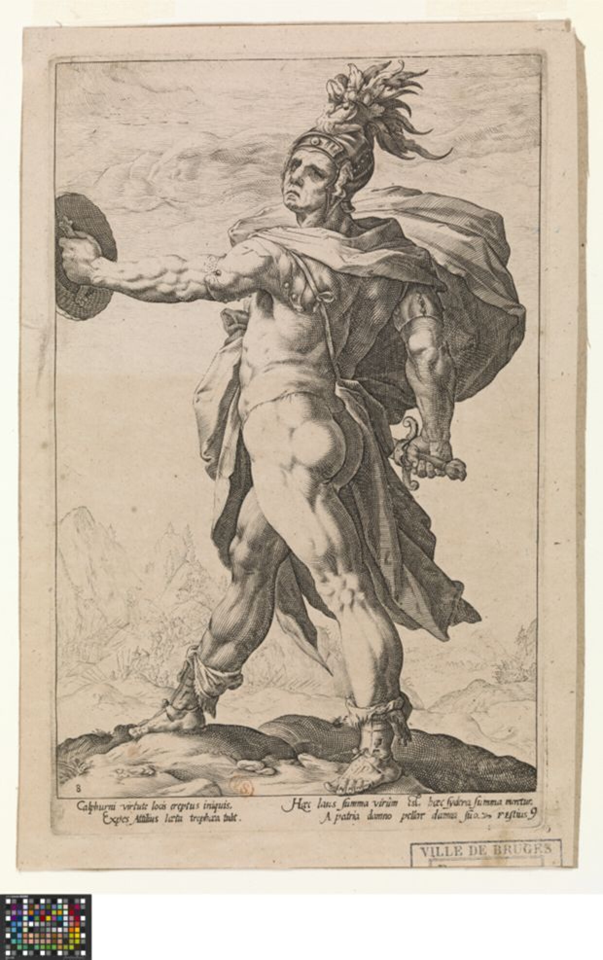 16de eeuw 18de eeuw 17de eeuwDe prent is een kopie, uitgegeven door Frederik de Wit en Joachim Ottens, naar de achtste prent (Hollstein VIII, p. 36, nr. 169.II) van een reeks van tien prenten met 'Romeinse Helden', gegraveerd door Hendrick Goltzius in 1586. Calphurnius, voluit afgebeeld in wapenuitrusting, zijn lichaam in profiel naar links en zijn hoofd naar de toeschouwer gekeerd, met gestrekte arm; in de achtergrond een landschap waarin een strijd plaatvindt; in de marge onderaan twee coupletten van elk twee versregels Latijnse tekst, geschreven door Franco Estius.