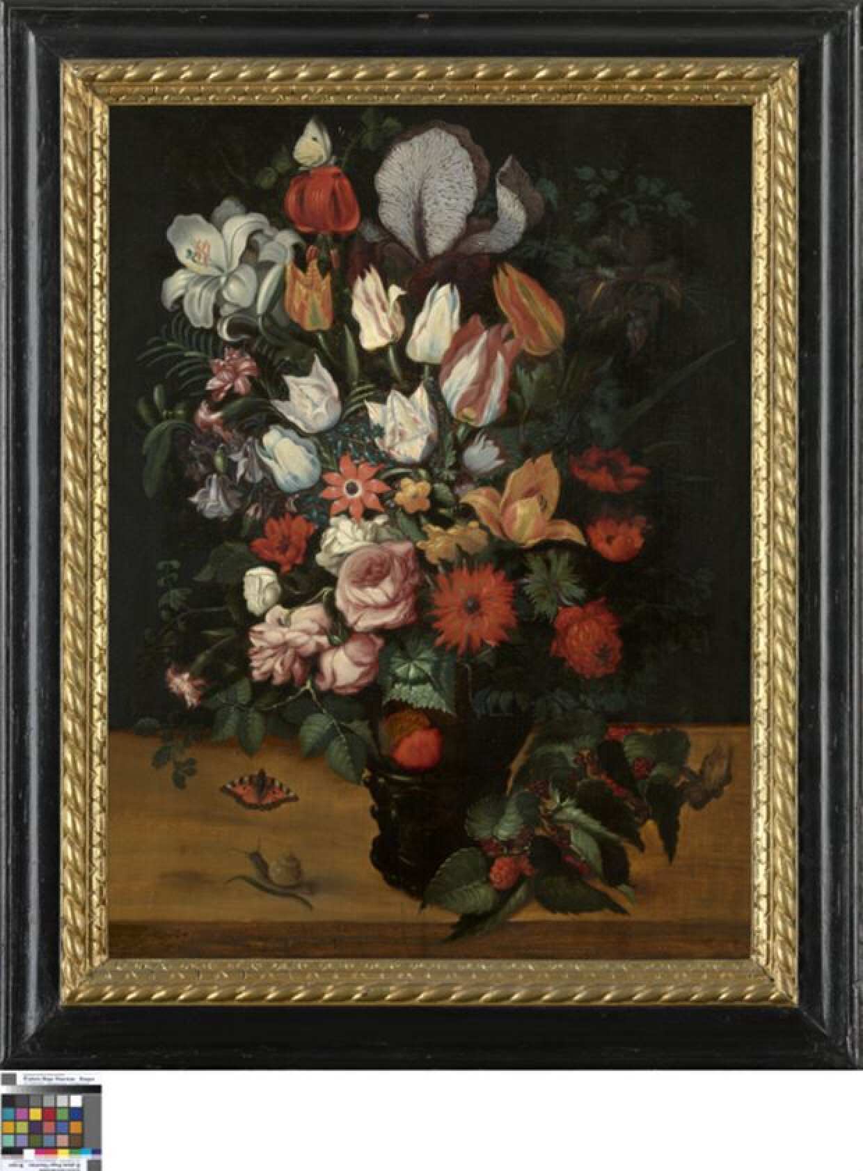 17de eeuwEen vaas met tal van verschillende bloemensoorten, in uiteenlopende kleuren, op een houten tafel. Ernaast kruipt een slak. Rond en op de bloemen enkele vlinders. Eerdere toeschrijvingen suggereren dat het werk door Andries Daniëls uitgevoerd kan zijn, of uit de omgeving van Osias I Beert zou komen. De maniëristisch gekrulde bloemen en bladeren, en het matte coloriet wijzen eerder in de richting van (de omgeving van) Roelant Savery.