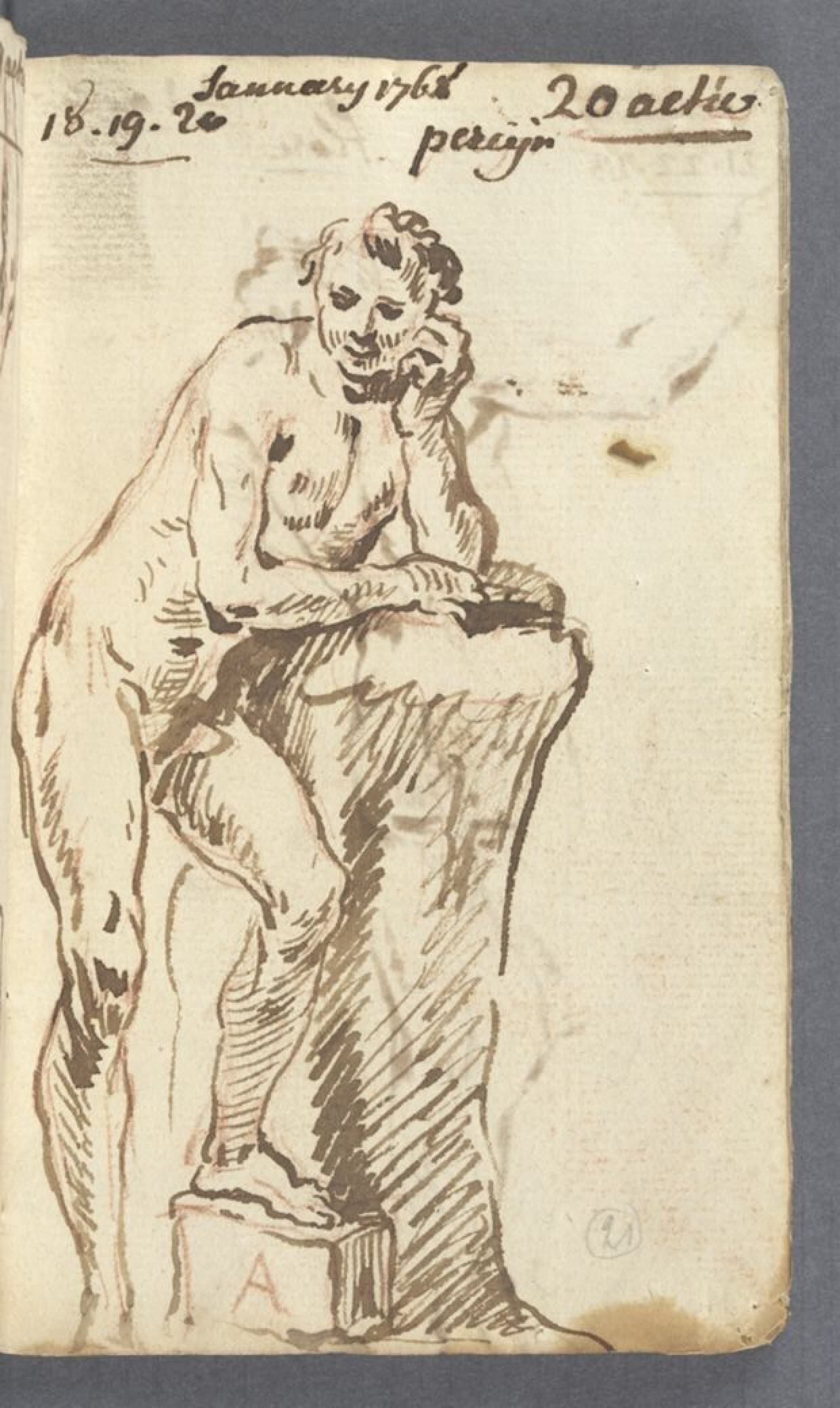 18de eeuwEenentwintigste bladzijde [elfde blad, recto] uit een notitieboekje van Jan Garemijn als directeur van de Academie Brugge, daterend uit het schooljaar 1767-1768. De pagina bevat een geschaduwde schets van een staand mannelijk naakt, weergegeven in driekwart naar rechts. Het model ondersteunt zijn hoofd met de linkerhand, zijn elleboog is daarbij op een hoge sokkel geplaatst. Het gezicht is frontaal weergegeven. Zijn rechteronderarm rust op dezelfde sokkel en hij buigt wat mee met zijn bovenlichaam. Het rechterbeen is gestrekt, het linkerbeen ontspannen en licht geplooid. Zijn linkervoet staat iets hoger, op een blok gemerkt met de letter A. De tekening is uitgewerkt in bruine inkt, met een ondertekening in vluchtige lijnen rood krijt. De schaduwzones zijn aangebracht met arceringen. Het gaat om de twintigste actie, geposeerd door het model Percijn op 18, 19 en 20 januari 1768.