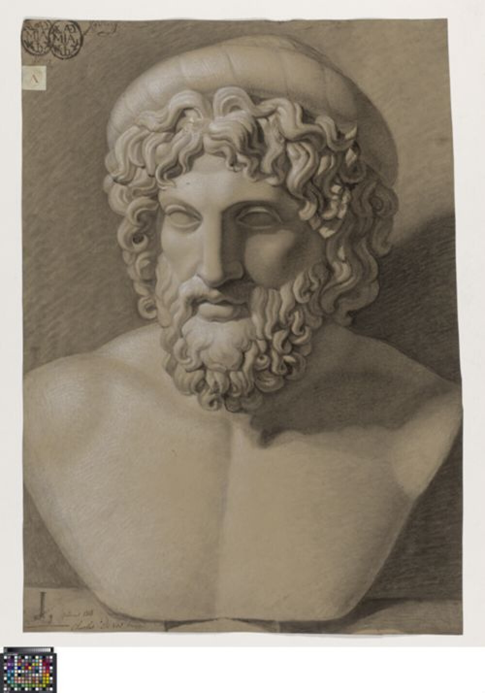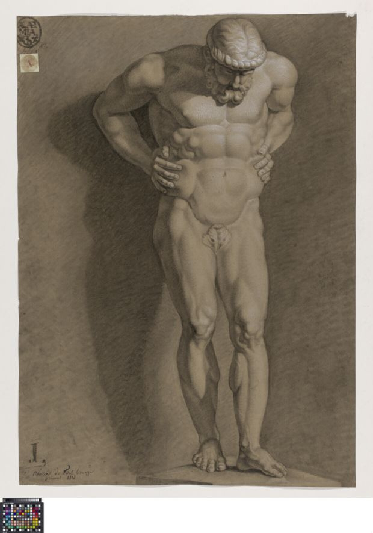 19de eeuwAcademische studie naar sculptuur van Atlas, getekend door Charles De Vos in 1818. De Vos was toen leerling in de klas naar plaaster aan de Academie Brugge. Voor de wedstrijd om prijs maakte hij twee studies (zie ook 0016.GRO0164.II) waarmee hij de tweede prijs zijn klas behaalde. Jean Naert werd tweede (0016.GRO0167.II). Een standbeeld van Atlas is voluit, in driekwart naar rechts weergegeven. Atlas is naakt, erg gespierd en staat rechtop met zijn linkervoet wat vooruit. Hij staat in gebogen houding, de handen op zijn heupen en gezicht naar beneden gericht. Naar welk beeld De Vos tekende is nog onduidelijk. Wel kan het beeld geïdentificeerd worden als Atlas op basis van een kopie gemaakt door Nicolai Outzen Schmidt. Daar is te zien dat op de schouders van Atlas wellicht een globe lag, die weergeeft hoe hij als straf het hemelgewelf diende te dragen. De Vost maakte zijn studie in zwart krijt of houtskool, gehoogd met wit krijt. De aantekeningen duiden op zijn wedstrijddeelname. Op het etiket staat zijn toegewezen tekenletter 'A'. Daarbij zijn de academiestempel en handtekening van directeur Ducq te zien. Dat De Vos de eerste prijs behaalde, werd linksonder met een 'J,' (of 1,) genoteerd. Nadien werden zijn naam en afkomst, behaalde wedstrijdtitel en het wedstrijdjaar onderaan opgeschreven.