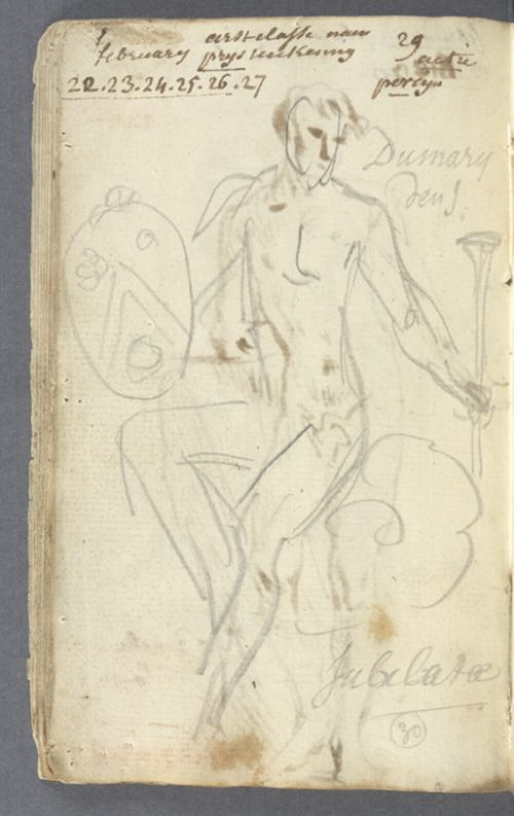 18de eeuwAcademische studie naar levend model van een zittend mannelijk naakt, getekend door Bernardus Bauwens in 1768. Met deze studie won hij de tweede prijs van het concours in de klas naar levend model aan de Academie Brugge. Voor deze speciale jubileumeditie tekenden de leerlingen het naaktmodel met feestelijke attributen in een decor van wolken. Het model draagt een lauwerkrans en houdt een wapenschild in zijn rechterhand. In zijn andere hand houdt hij een bazuin waarrond een vaandel gedrapeerd is. Op het vaandel staat het opschrift "JUBILEUM A[CADEM]IE [1]768", dat verwijst naar het vijftigjarig bestaan van de Academie Brugge. Het afgebeelde wapenschild met keper, twee vijfbladbloemen en hostie of ring met kruis, gevat in een cartouche is het wapenschild van de familie De Crits. De studie is getekend in zwart krijt of houtskool met hoogsels in wit krijt. Het gebruikte tekenpapier is een collage van twee vellen papier. Rechtsboven staat het jaartal van de wedstrijd, met daaronder de handtekening van assesseur of jurylid de Schietere de Caprijcke en directeur Jan Garemijn. Garemijn noteerde informatie over deze poseersessie in zijn notitieboekje 0000.GRO1676.2.II. Daardoor weten we dat het model Percyn zes opeenvolgende avonden poseerde in februari en maart 1768 voor de 29ste actie. Hij schetste daarbij de houding van het model met de bijhorende rekwisieten. De academietekening draagt de academiestempel rechtsboven met de tekenletter van Bauwens (M) op de omgeplooide hoek. Bauwens maakte nog een tweede studie tijdens dit jubileumjaar: 0016.GRO0006.II. Guillelmus Dumery won de wedstrijd en werd primus: 0016.GRO0025.II.