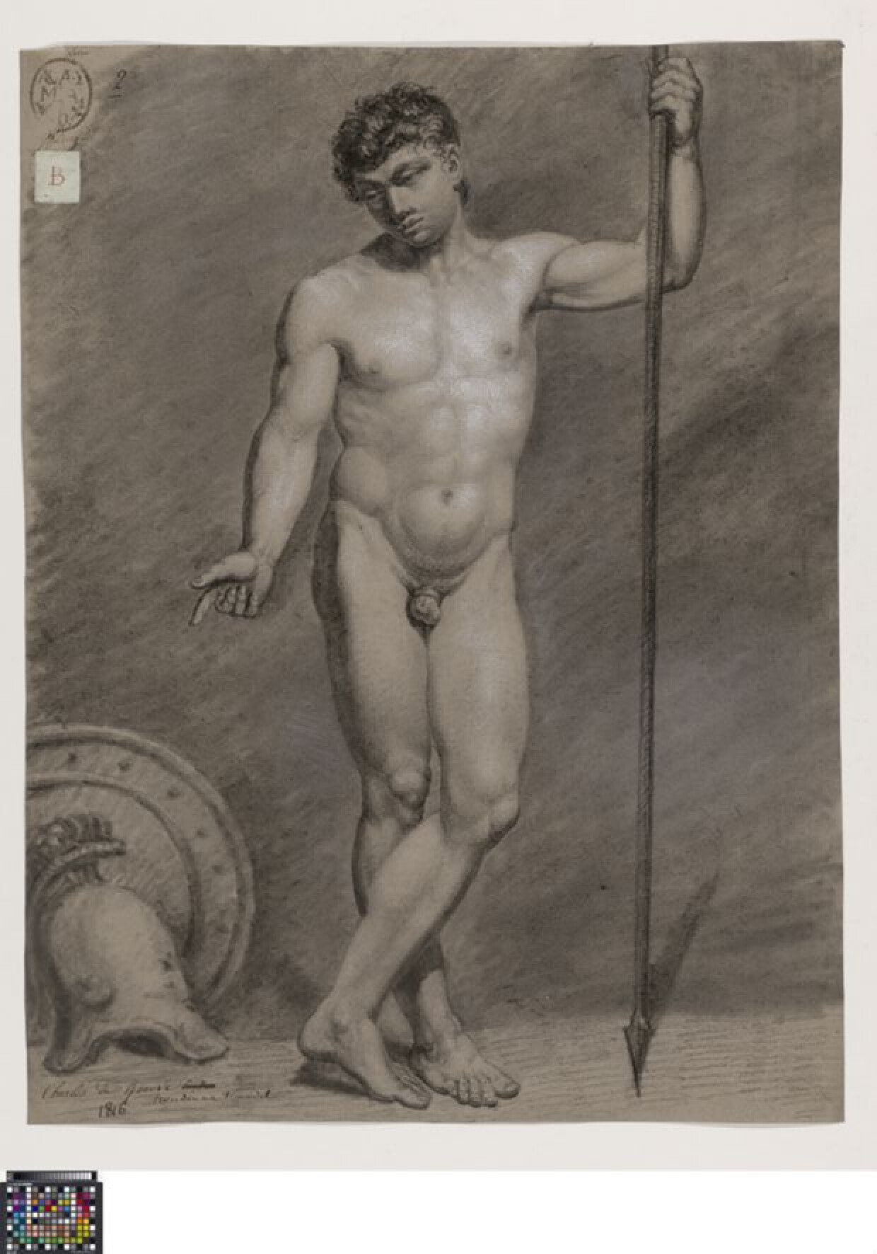 19de eeuwAcademische studie naar levend model van een mannelijk naakt, getekend door Charles De Graeve in 1816. De Graeve was toen leerling in de klas naar model aan de Academie Brugge. Voor de wedstrijd om prijs maakte hij twee studies (zie ook 0022.GRO0367.II), waarmee hij de tweede prijs behaalde. Frans Fleminck werd primus (0022.GRO0366.II). Een naakte man is voluit en frontaal afgebeeld. Hij staat met de voeten gekruist en houdt zijn rechterarm gestrekt naar onder, duim en wijsvinger uitgestoken. Het gezicht van de man is afgebeeld in driekwart naar links, zijn blik naar beneden gericht. Met zijn linkerhand omhoog houdt de man een speer vast die met de punt op de grond staat. Links zijn een schild en een helm te zien. De Graeve tekende deze studie in zwart krijt of houtskool, gehoogd met wit krijt. De bladranden zijn rondom afgesneden. De verschillende aantekeningen duiden op De Graeves wedstrijddeelname. Linksboven is de academiestempel met handtekening van directeur Ducq te zien. Op het etiket staat de tekenletter 'B', aan De Graeve toegewezen voor deze prijswedstrijd. Dat hij tweede werd, werd ook linksboven (cf. 2) genoteerd. Nadien werden zijn naam, het wedstrijdjaar en zijn behaalde wedstrijdtitel onderaan opgeschreven.