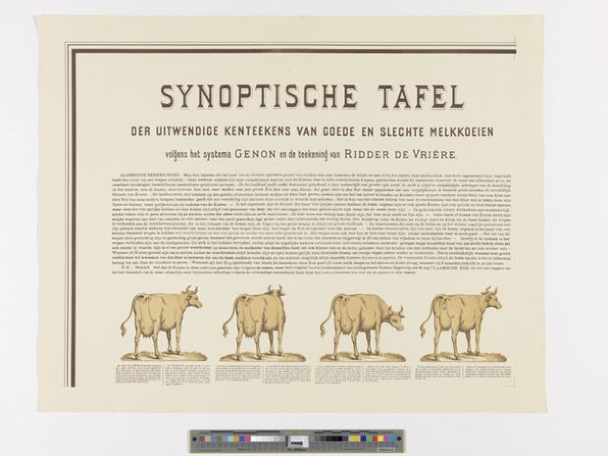 opschrift (in de voorstelling, bovenaan): SYNOPTISCHE TAFEL / DER UITWENDIGE KENTEEKENS VAN GOEDE EN SLECHTE MELKKOEIEN / volgens het systema GENON en de teekening van RIDDER DE VRIÈRE. / ALGEMEENE BEMERKINGEN. - Men kan beletten [...] als de andere in alle rassen.