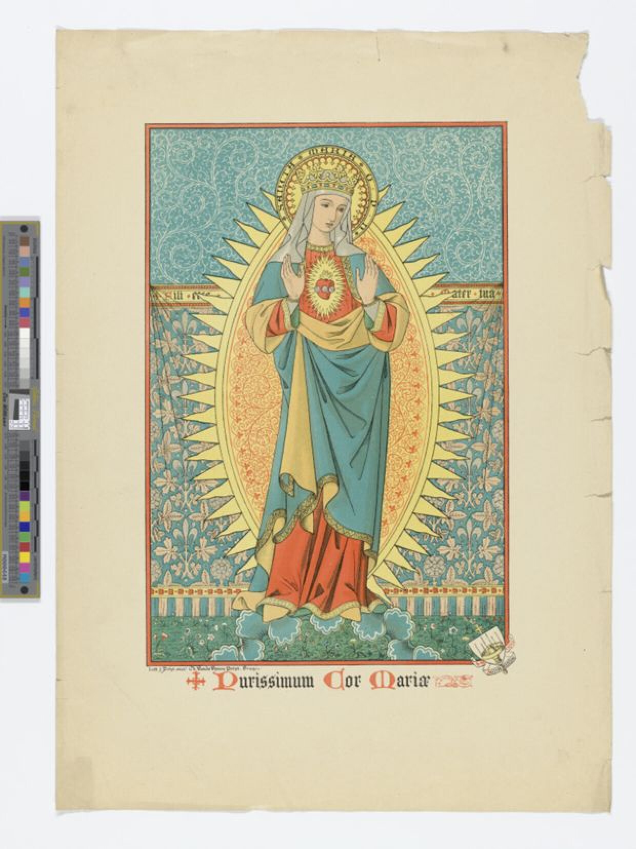 Devotieprent in neogotische stijl van Maria. De prent werd uitgegeven door uitgeverij Van de Vyvere-Petyt en de ‘Heilige Beeldekensgilde’. Met de oprichting in 1864 van de Heilige Beeldekensgilde (door o.m. kan. Adolf Duclos, Guido Gezelle en Joseph Neurath) drong de neogotiek definitief door in het Brugse drukwerk. De koploper in deze evolutie was de lithograaf Jakob Petyt (1822-1871). Sinds 1844 had hij zijn atelier in Brugge opgestart waar hij vanaf 1864 neogotisch drukwerk leverde. Na zijn dood, in 1871, nam zijn weduwe het bedrijf over. Vanaf 1875 kwam het bedrijf in handen van haar schoonzoon Karel Van de Vyvere-Petyt (1852 - 1922) tot 1914. Neogotische (bid)prentjes, diploma's en ander religieus drukwerk in kleurenlithografie vormden het handelsmerk van deze drukkerij.