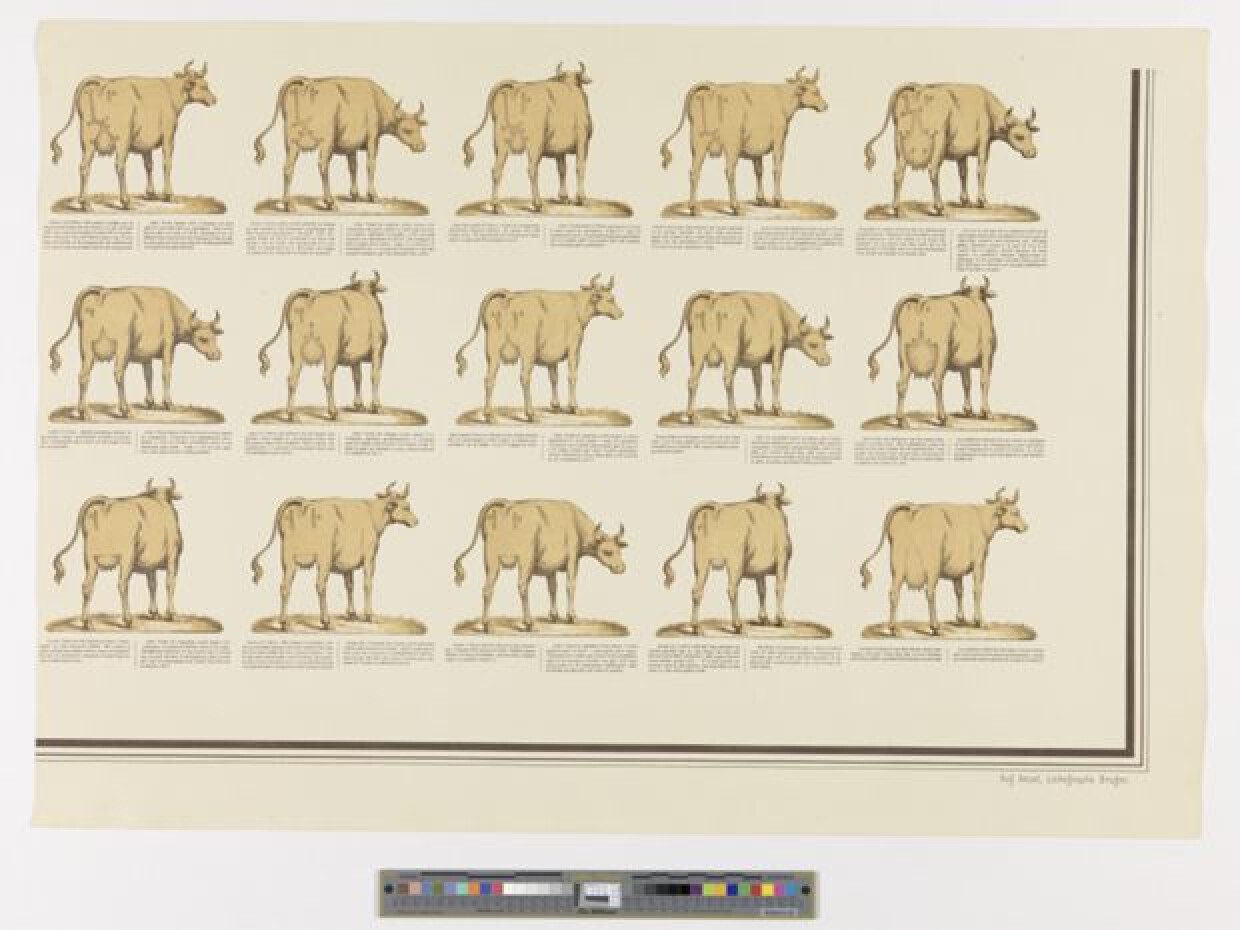 19de eeuwLithografie uit een reeks van 6 dezelfde affiches bestaande uit 6 prenten over de eigenschappen van goede en slechte melkkoeien met letteraanduidingen op de prent die de verschillende kenmerken aangeven. Onder elke afbeelding op de prenten staat de uitleg in het Nederlands en het Frans. Deze prent is gedrukt op een gele achtergrond. Deze prent is het rechter benedendeel van de affiche.
