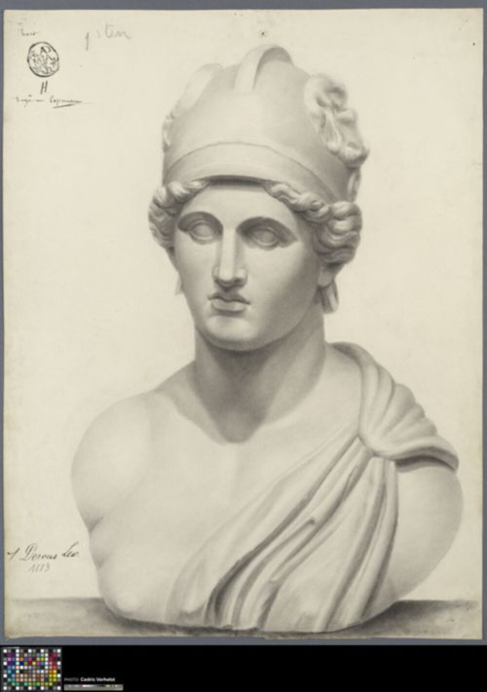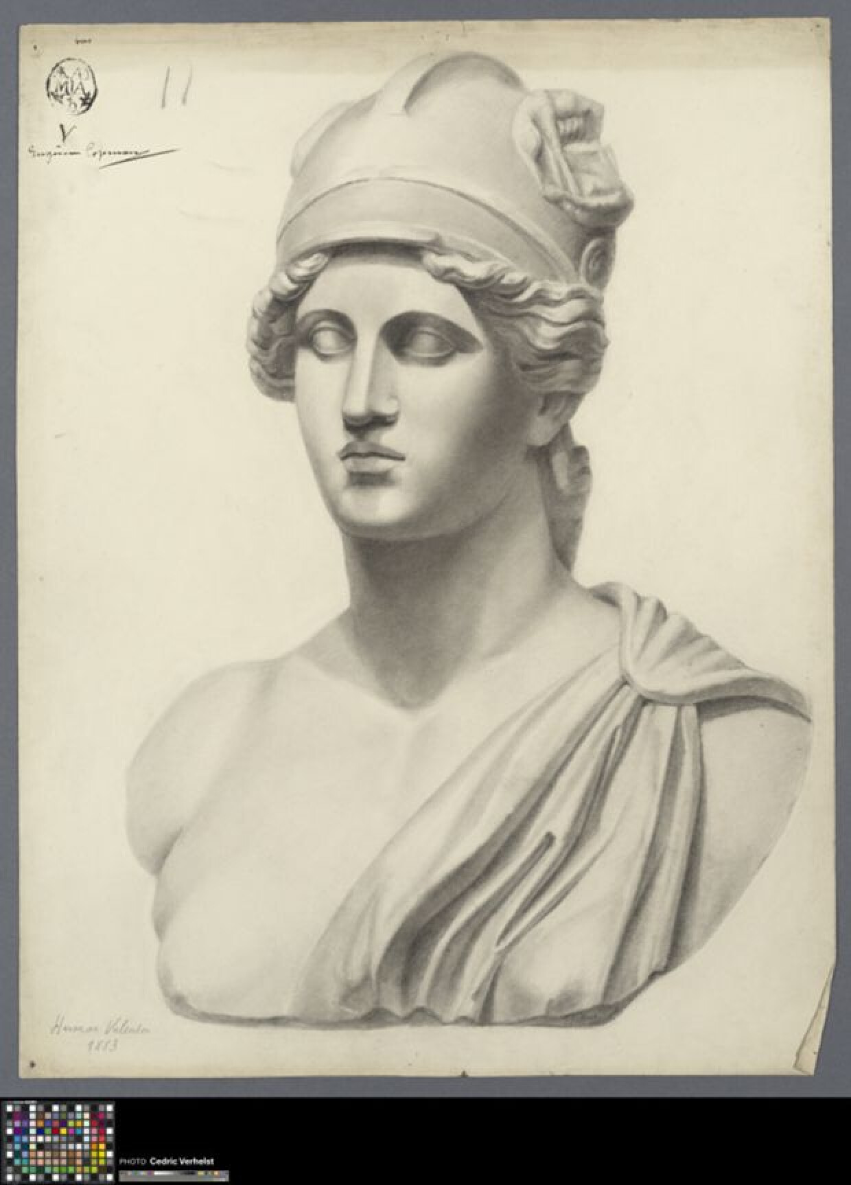 19de eeuwAcademische studie naar sculptuur van Rome, getekend door Valentin Henneman in 1883. Henneman was toen leerling aan de Academie Brugge in de klas naar het 'antiek - kop'. Hij maakte deze studie voor een wedstrijd en werd tweede. Leo Derous werd eerste (0022.GRO0567.II) en Arthur Drouillon behaalde een zesde positie (0022.GRO0597.II).Uit diezelfde wedstrijd zijn ook nog drie anonieme studies bewaard gebleven (0022.GRO0350.II; 0022.GRO0613.II; 0022.GRO0614.II). Henneman tekende naar een afgietsel van een buste van Rome (collectie Louvre). Een jonge man met een exomis vastgemaakt op zijn linkerschouder stelt de Italiaanse hoofdstad voor. Hij draagt een helm waar op beide zijdes een reliëf te zien is van de wolvin die Romelus en Remus zoogt. De buste is in driekwart naar links getekend met zwart krijt of houtskool. De aantekeningen duiden op Hennemans wedstrijddeelname. Linksboven is de academiestempel te zien, met zijn toegewezen letter 'V'. Dat hij tweede werd, noteerde men bovenaan (cf. II). Nadien werden linksonder zijn naam en het wedstrijdjaar opgeschreven.