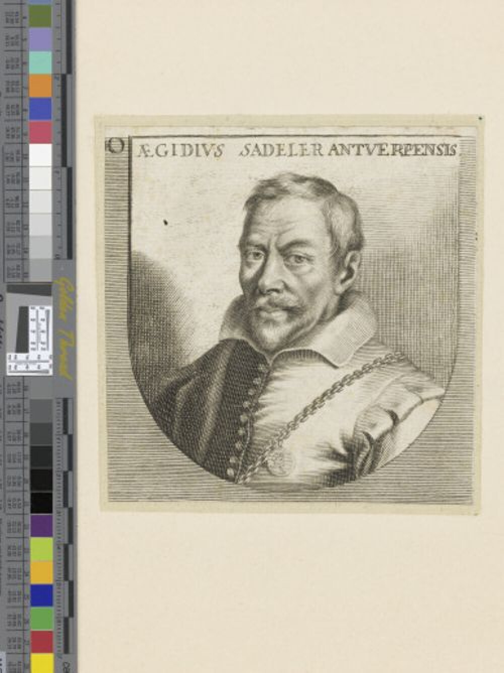 Busteportret van de kunstenaar Roelant Savery in een achthoekige omlijsting. Fragment van een prent met portretten van zes kunstenaars uit Italië, Frankrijk en de Nederlanden, een illustratie in: Joachim Sandrart, Teutsche Academie, 1675, II, boek 3, na p. 296.