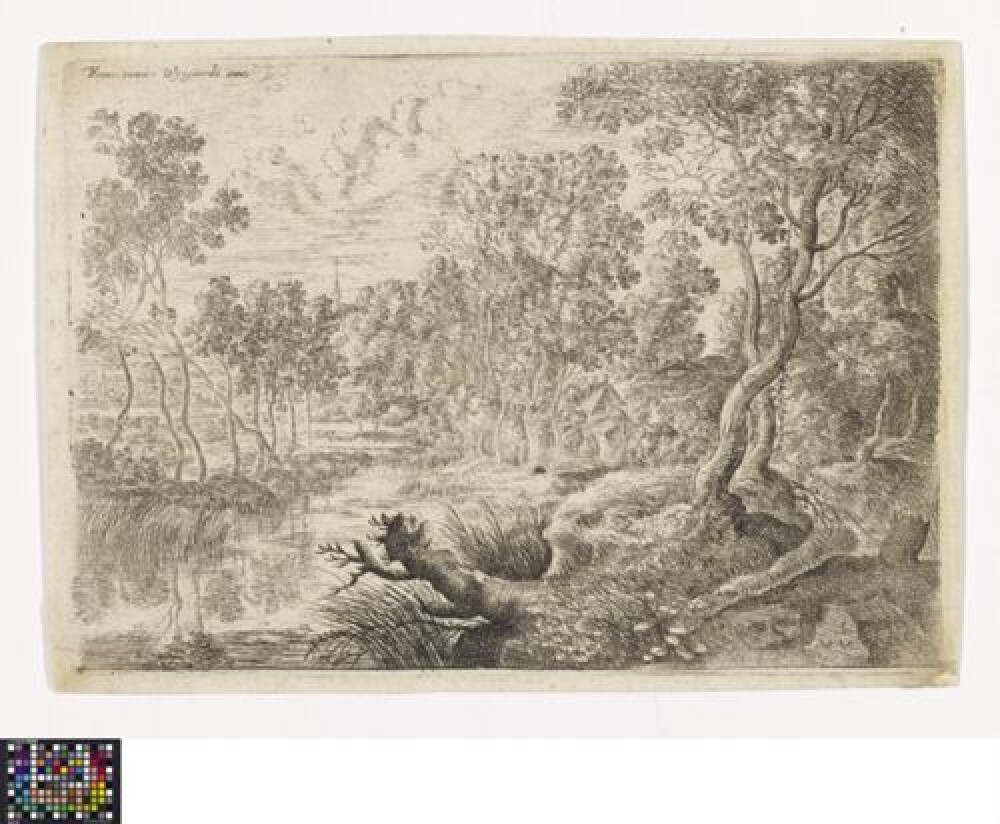 17de eeuwTwee mannen rusten aan het water, aan een open plek tussen de bomen. Verderop zijn enkele huisjes en een kerktoren te zien.