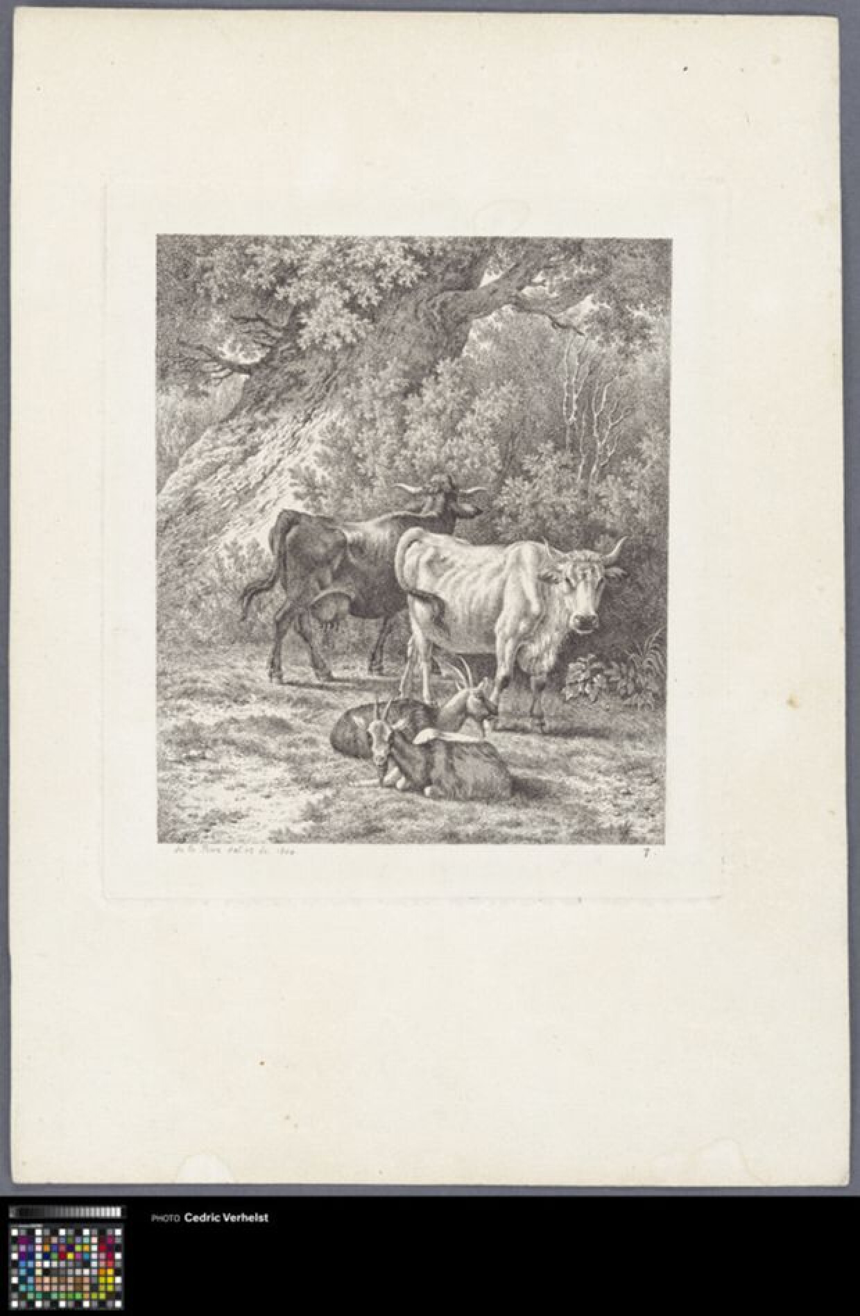 19de eeuwEts van twee koeien en twee geiten in een pastoraal landschap. Maakt deel uit van een reeks van 8 prenten met landelijke taferelen van koeien of geiten gemaakt in 1800. Pierre-Louis De la Rive was één van de grondleggers van de Zwitserse landschapsschilderkunst.