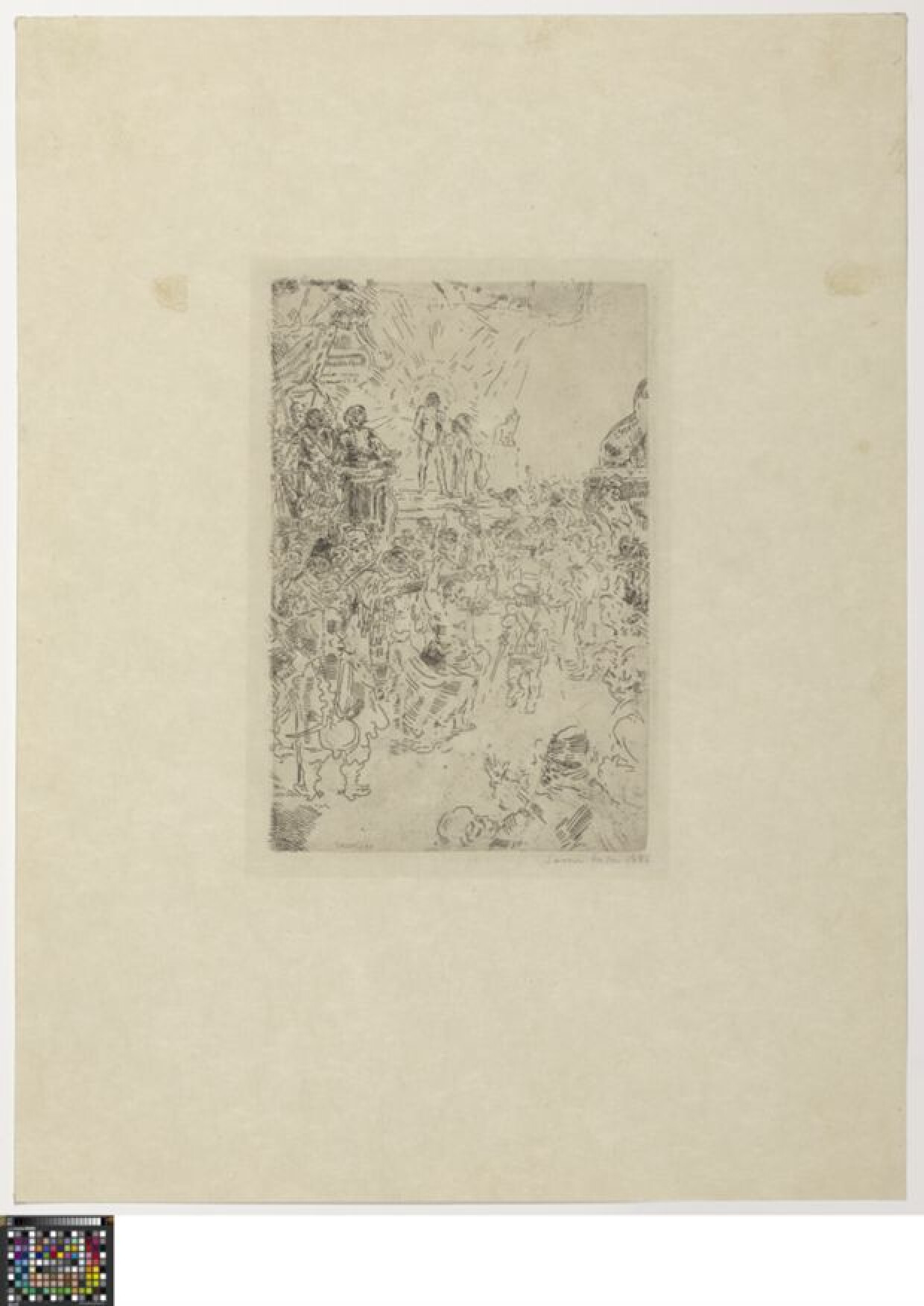 "Christus beledigd" of Christus als Ecce Homo wordt beschouwd als de eerste ets van Ensor. Sinds de middeleeuwen keert de thematiek regelmatig terug in de kunst. Ensor inspireerde zich trouwens herhaaldelijk op oude kunst. Hier verwijzen de compositie, de oriëntalistische figuren en de lichtwerking naar Rembrandt. Ook het clair-obscur van Gustave Doré werkte inspirerend. Typologisch stond het werk van Jacques Callot eveneens model, bijvoorbeeld in de man op krukken en de militair. Anderzijds verwijst de gebeeldhouwde leeuw recht tegenover Pontius Pilatus (gezeten op het podium) naar de ets "Chimaera", ontstaan in 1888. De ets is gebaseerd op twee tekeningen van Ensor uit 1885 met hetzelfde thema, in de reeks "De aureolen van Christus".