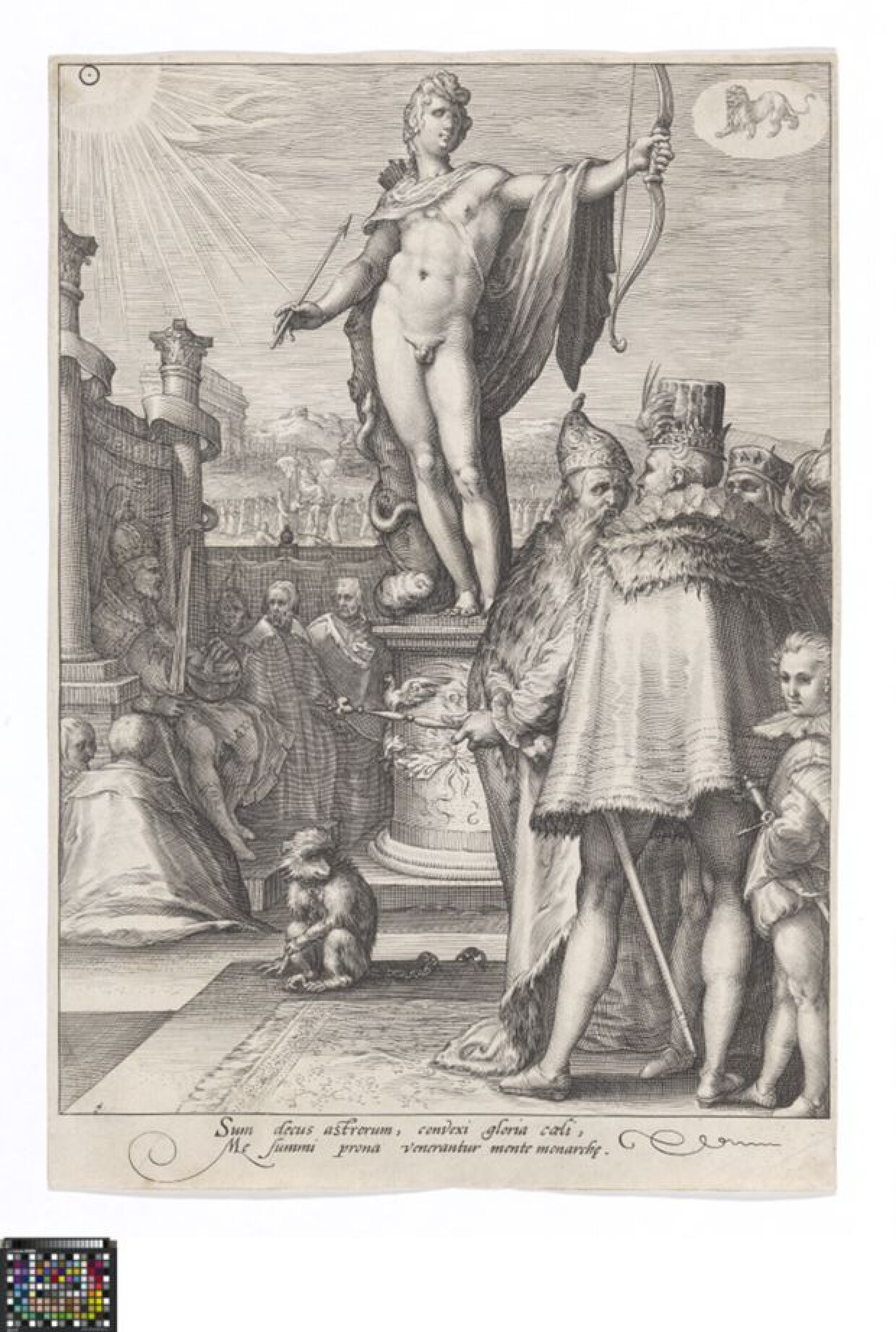 16de eeuwApollo is met pijl en boog in zijn handen weergegeven op een sokkel. Rondom hem, staand en zittend, verschillende regeerders. Links in de voorgrond zit een vastgeketend aapje. In de linkerbovenhoek is een zon voorgesteld en in de rechterbovenhoek het sterrenbeeld leeuw. Deze gravure is de vierde prent uit een reeks van zeven met de zeven planeetgoden, gegraveerd door Jan Saenredam naar ontwerp van Hendrick Goltzius (New Hollstein 660.I/II).