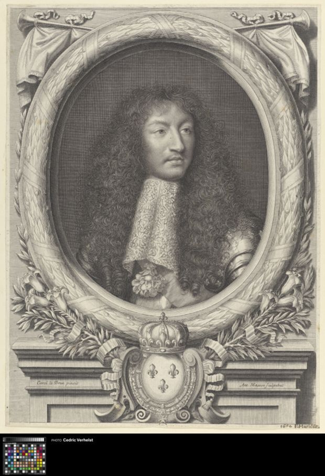 17de eeuwPortret van de Franse koning Lodewijk XIV (1638-1715), ten halve lijve naar links, met het hoofd sterk naar rechts gedraaid. De Zonnekoning heeft lang krullend haar en draagt een luxe kanten kraag. Op het harnas op zijn linkerschouder zijn kleine Franse lelies gegraveerd. Het portret is omlijst door een ovalen kader met erboven aan weerszijde een trompet met vaandel. Aan de onderkant van de lijst is het wapenschild van de koning afgebeeld, met drie Franse lelies en een kroon. Uit het wapenschild steken takken met lelies omhoog, tot onder het portret. Het geheel rust op een rechthoekige lijst, waarin de namen van de makers gedrukt staan.