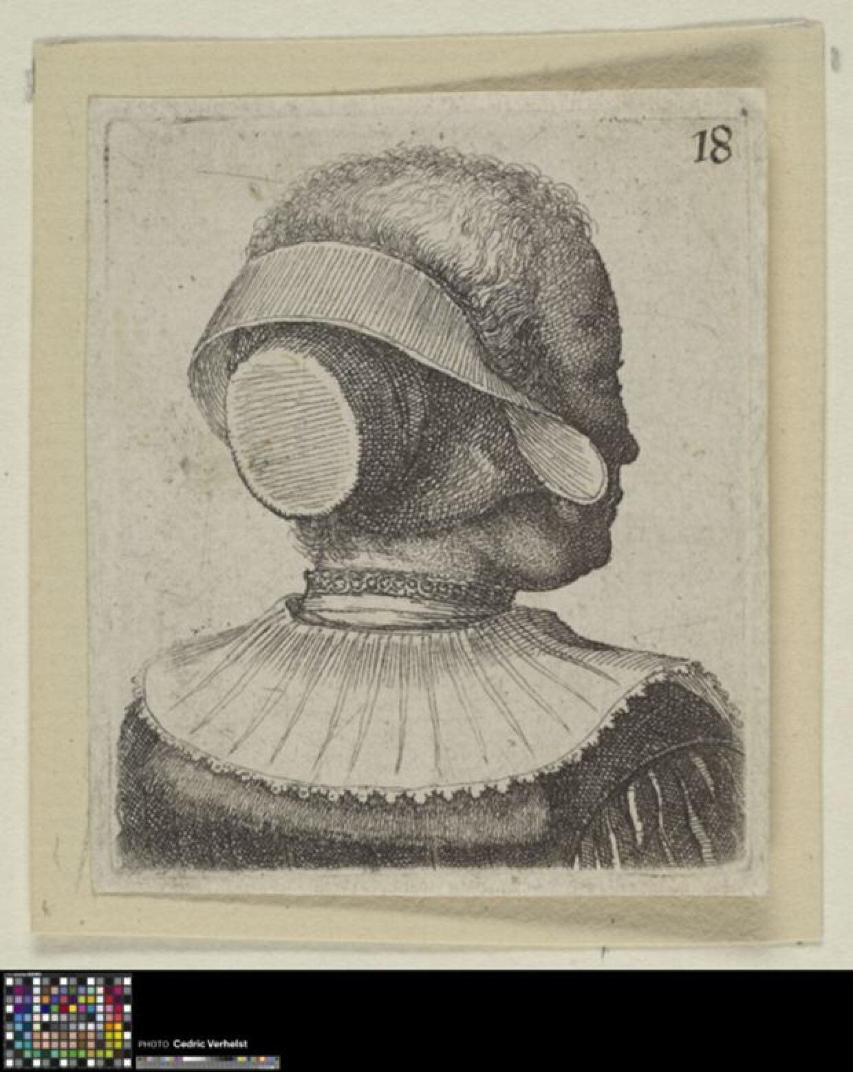 17de eeuwDeze prent toont de schouders en het achterhoofd van een vrouw. Ze draagt een donker gewaad, een lange, witte kraag en een kapje. Haar hoofd is licht gedraaid naar de toeschouwer.
