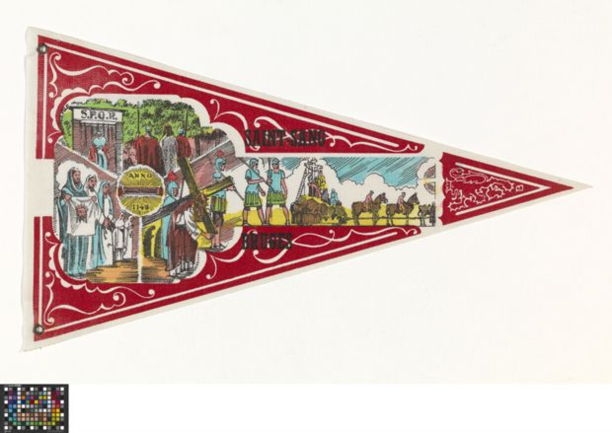 20ste eeuwBedevaartvaantje van linnen. Heilig Bloed te Brugge, type Hoyaux fils. Gelijkbenige driehoek van links naar rechts. Meerkleurendruk met rode achtergrond. Vervaardigd door Hoyaux Fils te Brussel. Links een gelobd vierkant met drie afbeeldingen rondom het centrale H. Bloed in een stralenkrans en met het opschrift 'anno 1148'. Er worden taferelen uit de H. Bloedprocessie weergegeven. Een praalwagen met historische figuur erop onder een pport met opschrift 'S.P.Q.R.', met daarvoor Jezus geflankeerd door twee soldaten; enkele vrouwen waaronder Veronica die een doek vasthoudt met de afdruk van Jezus zijn gezicht, en Jezus die zijn kruis draagt. In de band die rechts uit het gelobd verkant loopt wordt een praalwagen voortgetrokken waarop uitgebeeld wordt hoe Jezus van het Kruis gehaald wordt. Daar boven- en onder het Franse opschrift 'Saint- Sang Bruges'.