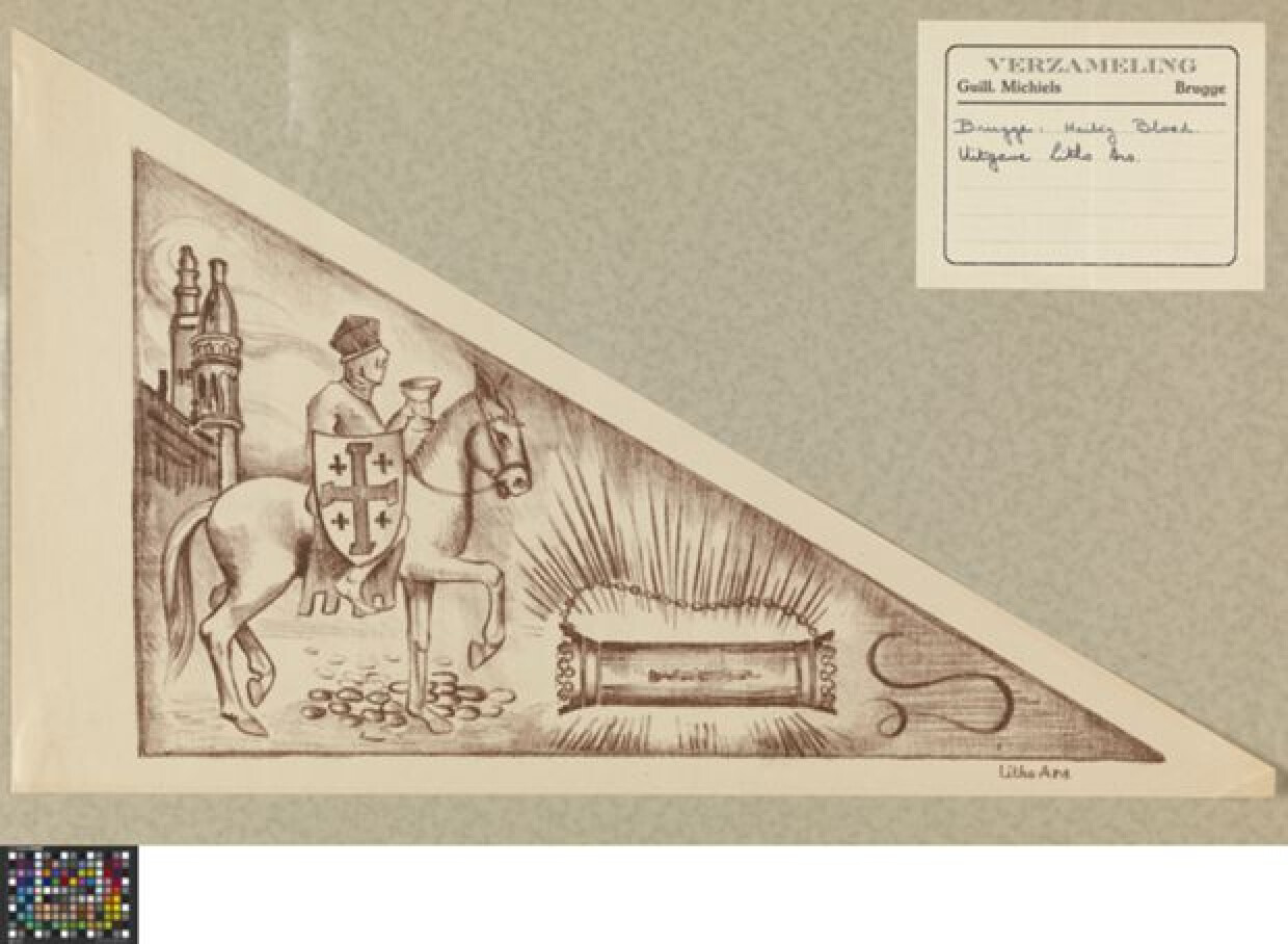 20ste eeuwDubbel bedevaartvaantje van het Heilig Bloed te Brugge, type Litho Ars 1946. Rechthoekige driehoek van rechts naar links. Uitgegeven door Litho Ars in 1946. Op de voorzijde staan twee silhouetten van toren als beeld van de oude stad. Ervoor zit graaf Diederik van den Elzas te paard, met een kelk in de linkerhand en een wapenschild in de rechterhand. Rechts wordt de reliek van het Heilig Bloed weergegeven, met een koord eraan en door stralen omgeven. Op de keerzijde opnieuw een silhouet van het belfort, met op de voorgrond het opschrift '12 mei '46 Brugge'. In de linkerbenedenhoek staat een kroon.