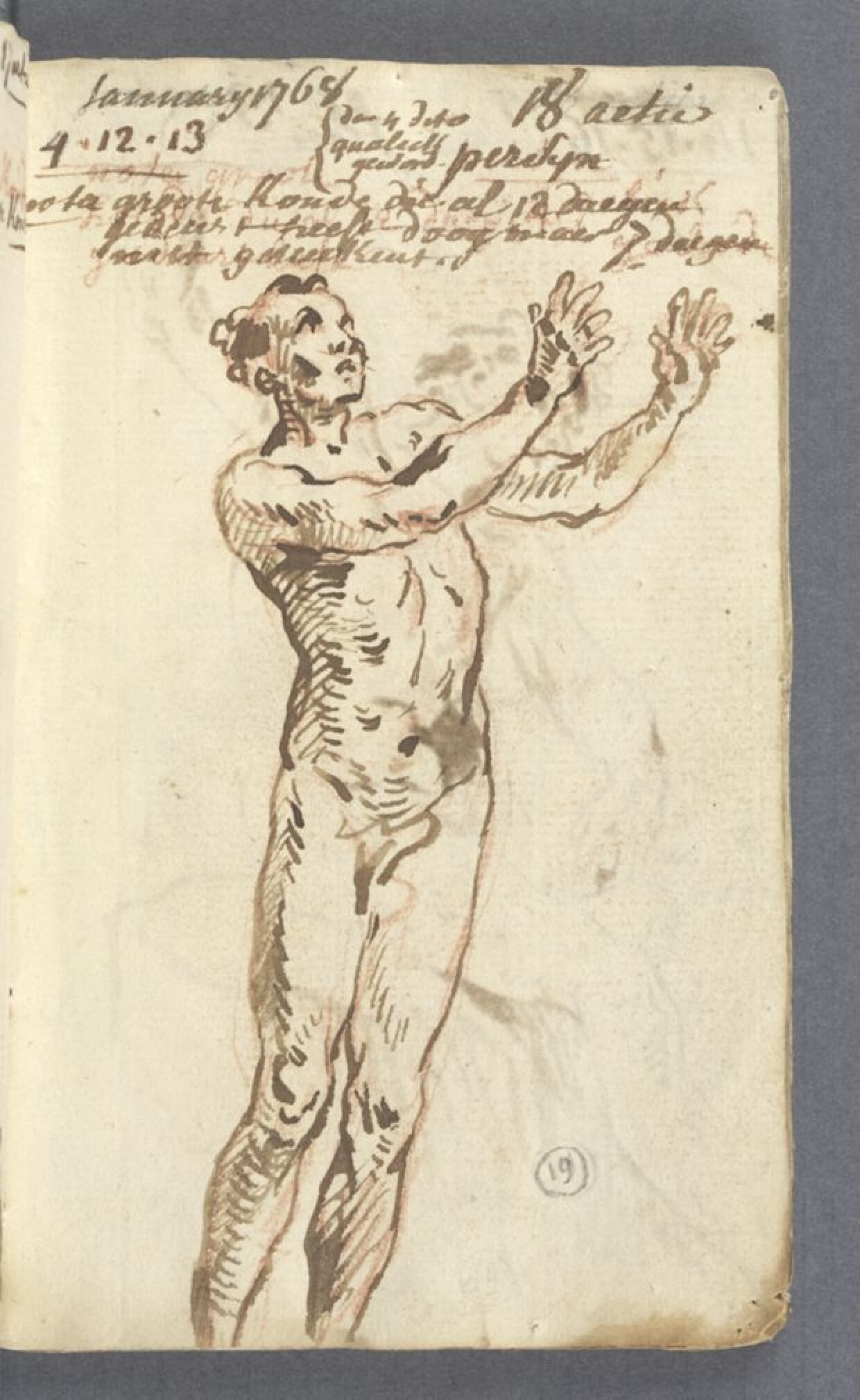 18de eeuwNegentiende bladzijde [tiende blad, recto] uit een notitieboekje van Jan Garemijn als directeur van de Academie Brugge, daterend uit het schooljaar 1767-1768. Op deze bladzijde is een geschaduwde schets getekend, van een staand mannelijk naakt, frontaal weergegeven. Het model is afgebeeld van het hoofd tot aan de enkels. Zijn gezicht en torso zijn driekwart naar rechts gedraaid. De man kijkt omhoog. Met opgetilde armen lijkt hij iets op te vangen. De tekening is uitgewerkt in bruine inkt, met een ondertekening in vluchtige lijnen rood krijt. De schaduwzones zijn aangebracht met arceringen. Het gaat om de achttiende actie, geposeerd door het model Percijn op 4, 12 en 13 januari 1768. De notities bovenaan geven ook aan hoe het er tijdens de poseersessies aan toe ging. Zo schreef Garemijn dat er een periode van 'groote koude' was aangebroken die twaalf dagen geduurd heeft. Toch hebben ze maar zeven dagen niet getekend. Dit kan misschien ook de reden zijn waarom het model op de eerste avond onwel geworden is en de sessies pas op twaalf januari werden hervat.