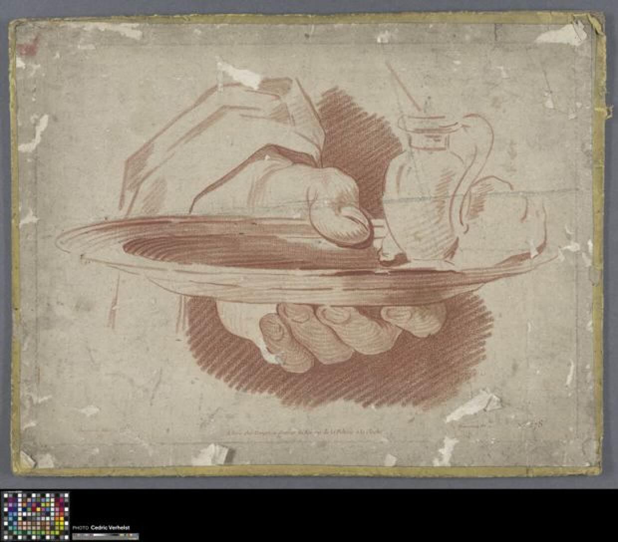 18de eeuwAcademische prent met een studie van een hand die een dienblad vasthoudt met daarop een vaasje. Het gaat om een gravure in crayonmanier in rode inkt. De tekening is gegraveerd door Gilles Demarteau naar werk van Louis Durameau. De prent is verlijmd op een steunkarton van liggend formaat, bekleed met papier. De gravure valt binnen een reeks reproductiedrukken gegraveerd door Gilles Demarteau. Demarteau, werkzaam tussen 1755 en 1776, was gespecialiseerd in crayonetsen. Het onderschrift van de prent vermeldt zijn functie als 'graveur du Roi'. De prent is gedrukt in zijn atelier in Parijs (Rue de la Pelterie à la Cloche). Zijn werken zijn genummerd en opgenomen in de catalogus van Lemayrie (1896). De studie van de hand met het dienblad draagt het nummer 278. De functie van de prent kan gekaderd worden binnen de educatieve context van kunstacademies. Reproductiedrukken van kunstwerken dienden als lesmateriaal in de Academie Brugge. De prent toont gebruikssporen: er is fysieke schade en er zijn aanduidingen om verhoudingen te tekenen, zoals bv. op het vaasje.
