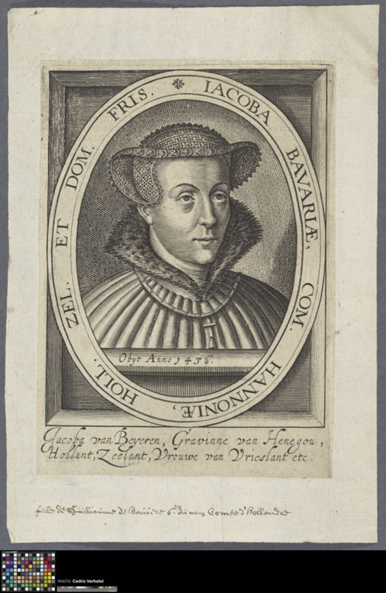 (circa 1614 - voor 1617)Portret van Jacoba van Beieren (17 juli 1401 - 9 oktober 1436). Ze is ook bekend onder de naam Jaque of Jacob. Jacoba van Beieren was van 1417 tot 1433 gravin van Henegouwen, Zeeland en Holland. Op zestienjarige leeftijd volgde ze haar vader op tot gravin van Henegouwen. Jacoba van Beieren is centraal gepositioneerd en is een klein beetje naar rechts gedraaid. Ze draagt een versierde hoed en heeft een ketting met kruis om haar nek. Ze draagt een mantel waarbij de kraag met bont is afgewerkt. De prent maakt deel uit van de reeks "Historie der Nederlandscher ende haerder na-buren oorlogen ende geschiede [...]," van Emanuel Van Meteren in 1614 te Den Haag. (De prent maakt deel uit van het album met (losse) portretten uit de 16de en 17de eeuw (2014.GRO0019.III)).