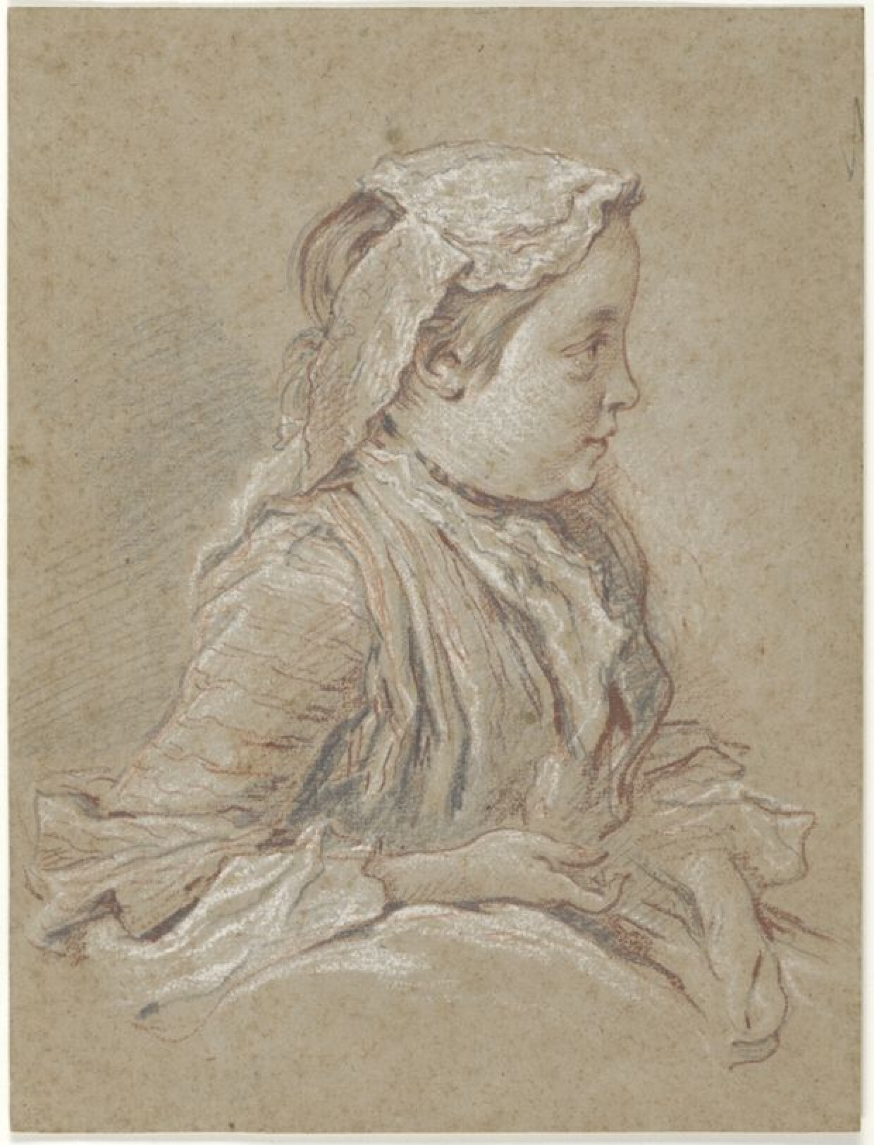 18de eeuwDe jonge vrouw is zittend afgebeeld naar rechts met kanten muts. De tekening is vermoedelijk een vroeg werk, gemaakt in de jaren 30 van de achttiende eeuw. De wulpse trekken die geregeld terugkeren in zijn seculiere werk laat Boucher hier achterwege. De kunstenaar maakt een eerlijk en elegant portret van de vrouw. Zij behoort tot de opkomende bourgeoisie die maar weinig vertegenwoordigd is in het oeuvre van Boucher. Hij maakte slechts enkele portretten en voor deze werken stonden vaak figuren uit de hogere klasse model. Er is geen schilderij bekend waarvoor Boucher deze tekening gemaakt zou hebben en het karakter van de voorstelling doet eerder vermoeden dat het een opzichzelfstaande tekening is. Omdat het werk is gemaakt rond 1730 en in verband met de sociale status van de geportretteerde wordt vermoed dat het gaat om een voorstelling van een jonge Marie-Jeanne Buseau, dochter van Jean-Baptiste Buseau. Boucher trouwde haar in 1733. De identificatie is echter niet zeker. Boucher heeft een subtielestijl die in deze tekening goed tot uiting komt. Zijn virtuoze hand en subtiele kleurenpallet is te herkennen in de vloeiende lijnen en de zorgvuldig uitgewerkte kleurstelling in de tekening. De licht maar treffend geschetste handen van de dame zijn kenmerkend voor de stijl van Boucher. De tekening is in langdurig bruikleen van de Stichting Jean van Caloen (inv. nr. VCL 1896). Gebaseerd op: Pascal Ruys-Raquez in: tent. cat. Esquisses, pastels et dessins de François Boucher dans les collections privées, Musée Lambinet, Versailles 2014, p. 50; Pascal Ruys-Raquez in: tent. cat. European Master Drawings Unveiled. Van der Goes, Michelangelo, Van Goyen, Fragonard and other masters from Belgian collections, Kunsthal Rotterdam 2002, pp. 257; en Alastair Lang, The Drawings of François Boucher, New York 2003, pp. 158-159.
